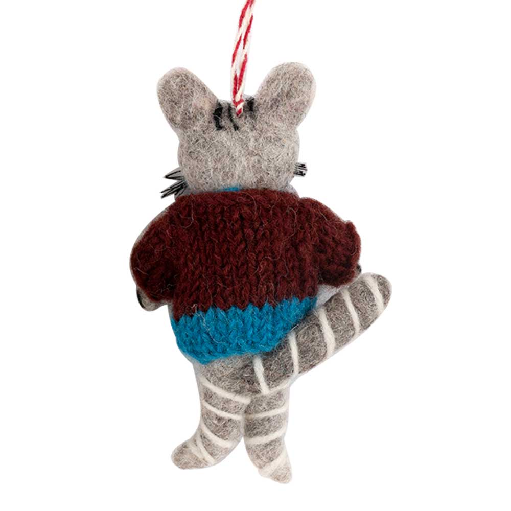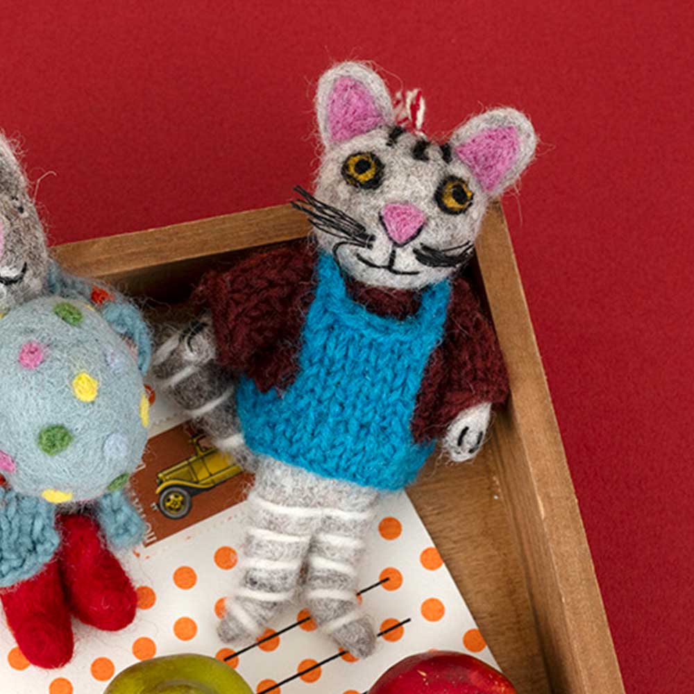 【完成品】ニットのウエアもおしゃれな、フェルト製のオーナメント3種です。それぞれ個性豊かな表情やファッションが楽しめます。クリスマスツリーなどに飾っても。