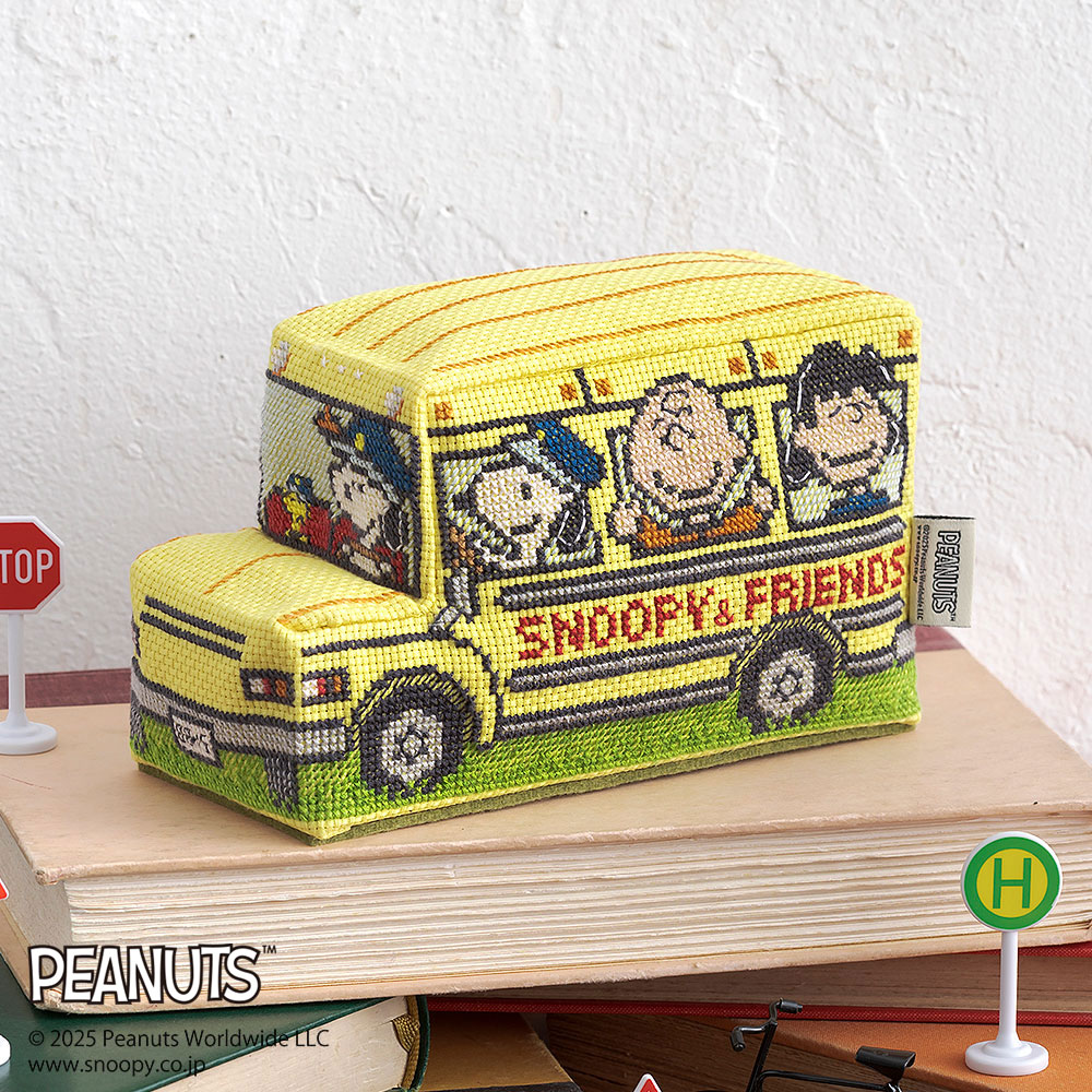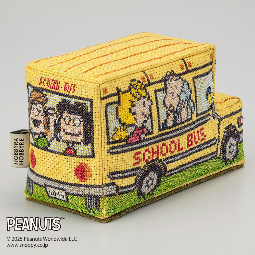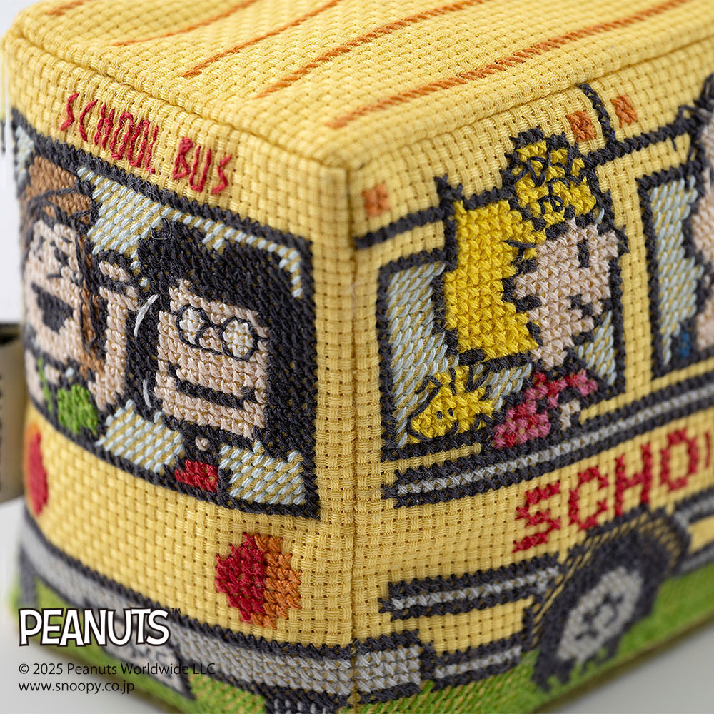 【キット作り方つき】楽しみながら作れそう。スクールバスに乗る、スヌーピーと仲間たちをクロスステッチして立体的に仕立てます。上級の方向きです。