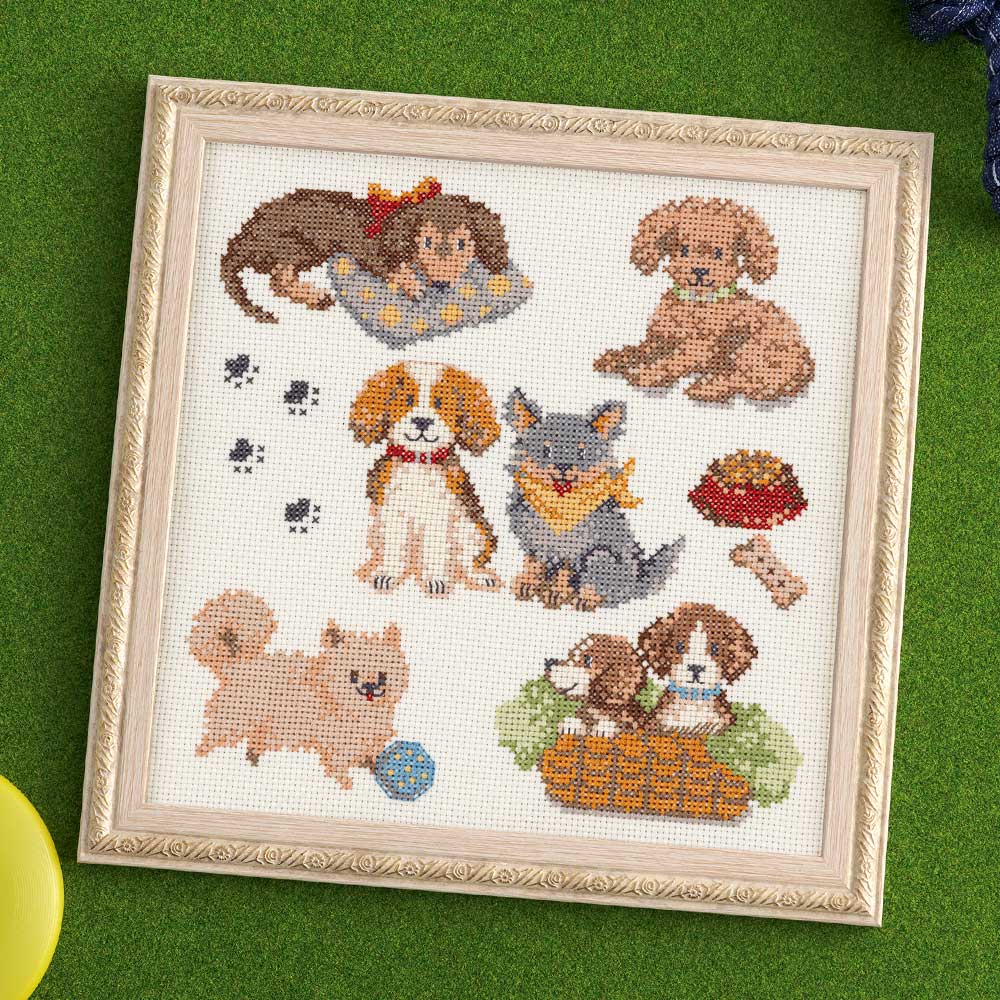【キット作り方つき】【フレームつき】 ボールで一緒に遊んだり、少しおめかししてみたり。愛らしい犬達との様々な日常をクロスステッチに切り取りました。中級の方向け。