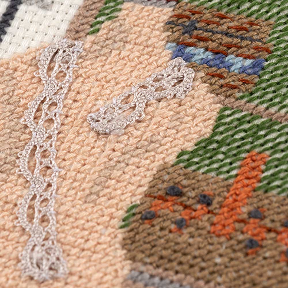 綿の刺しゅうクロス(14カウントジャバクロス/生成り)、刺しゅう糸、ラメ糸、レース、ビーズ、チャーム、フレーム、木のバー、ボール紙、針、糸通し