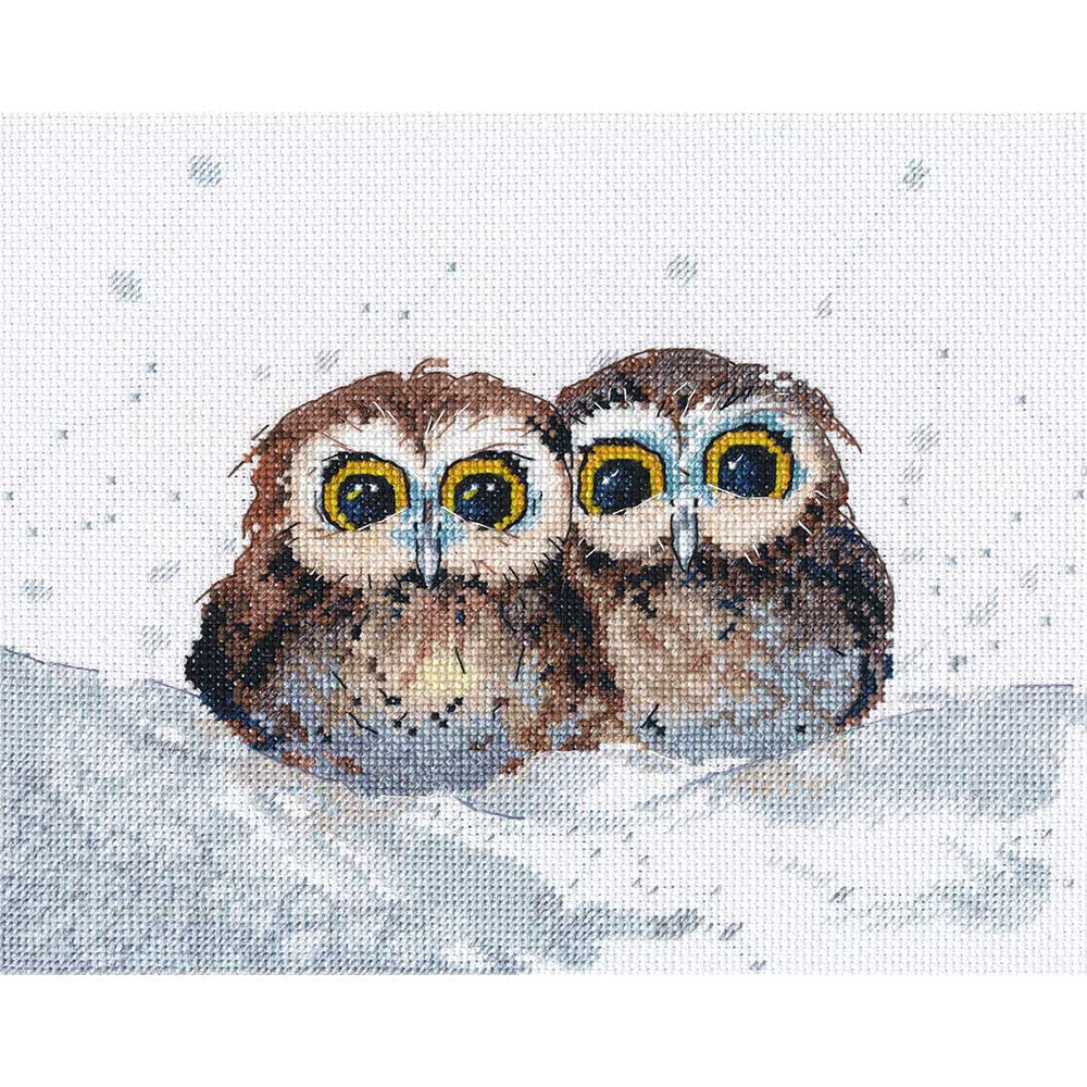 【キット作り方つき】 雪の中で身を寄せ合う、2羽のフクロウを描いたクロスステッチ作品です。中級の方向き。ロシア・OBEN社製。