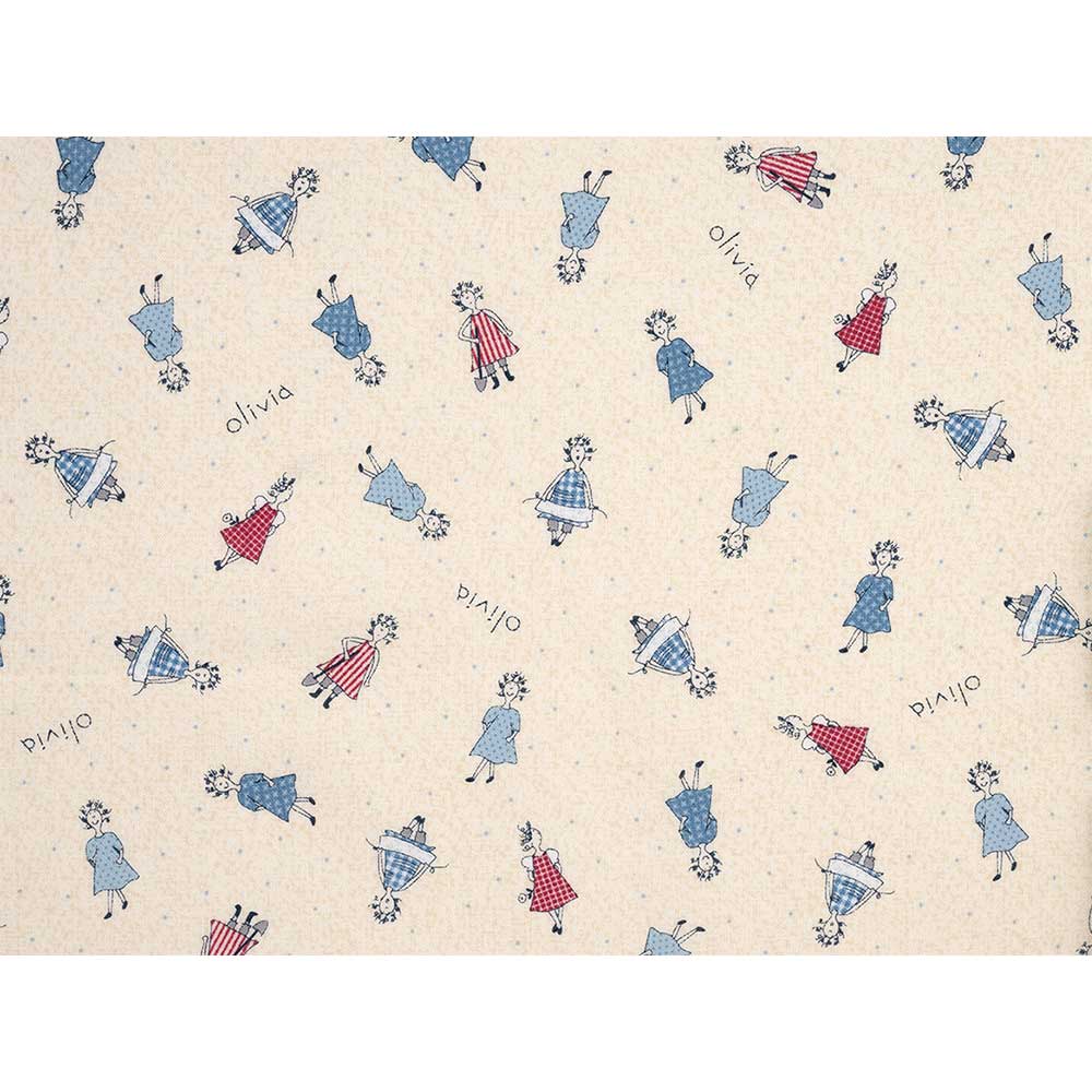 小さなオリビアをモチーフにしたキュートなプリント布。ニュアンスのある地模様に、いろいろな洋服を着たオリビアが描かれています。バッグや小物の他、裏布などに使ってもおしゃれ。