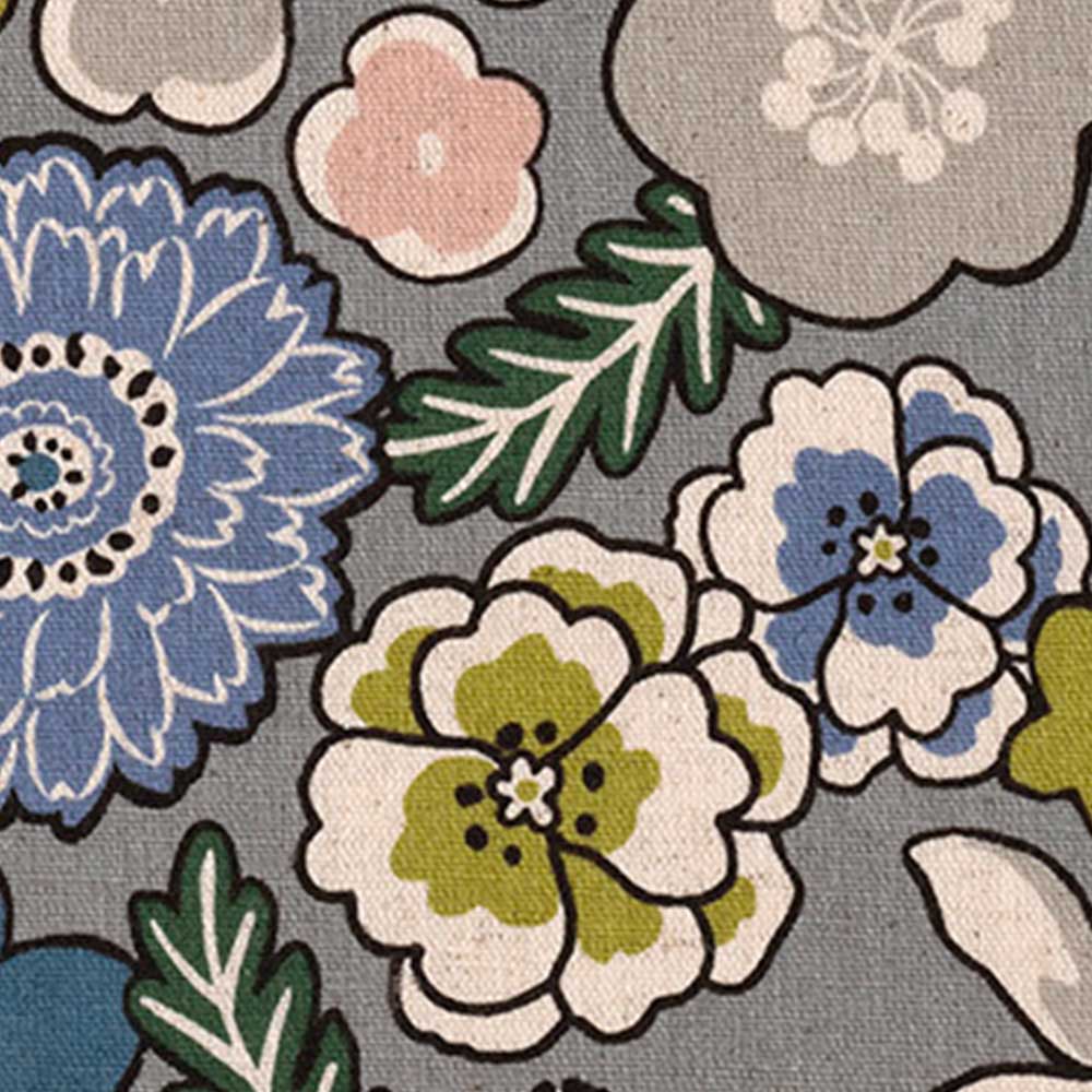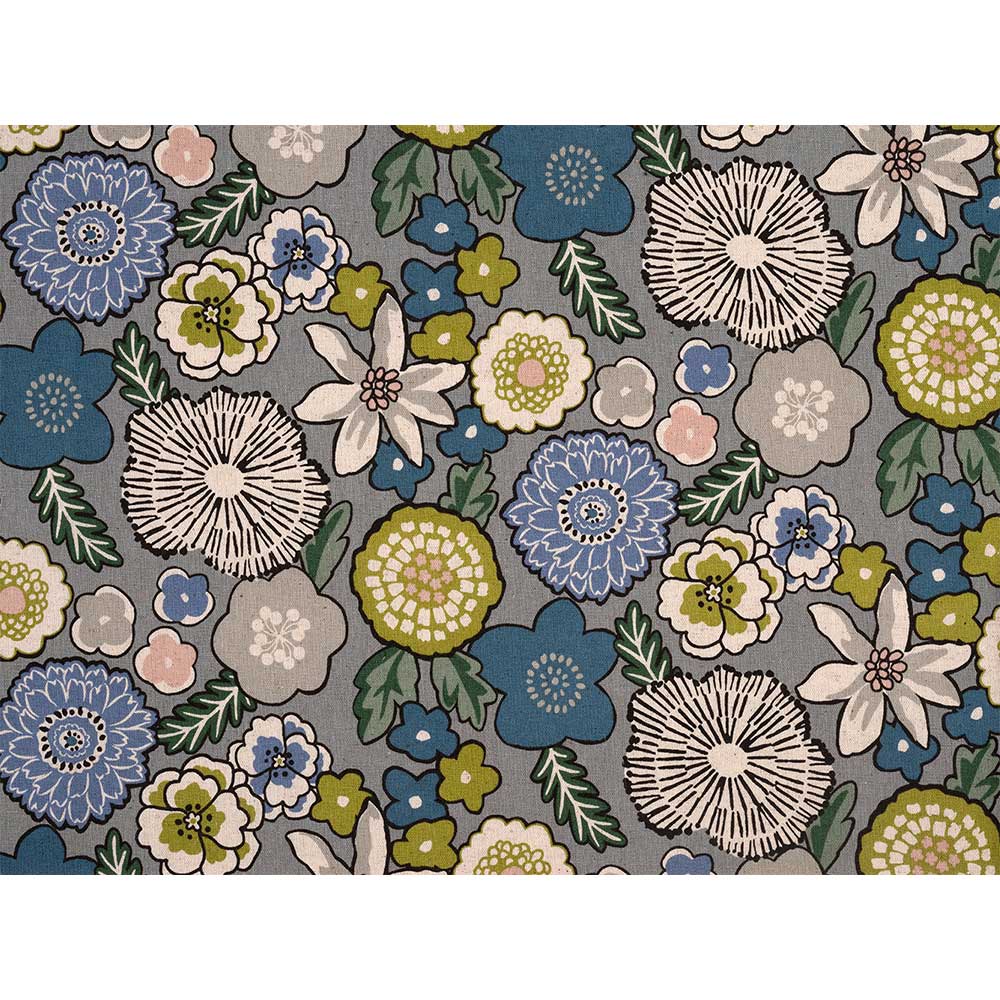 やや厚手の綿麻のグレー地に、北欧風の花モチーフをプリント。綿殻入りのナチュラルな風合いと素朴なタッチがマッチして、程よく賑やかで落ち着き もある雰囲気です。バッグやインテリアなどに。
