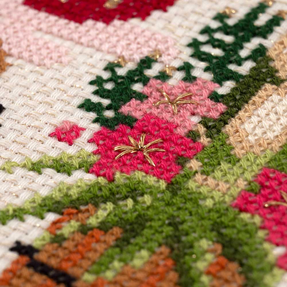 綿・ポリエステル・ナイロン混の刺しゅうクロス(14カウントラメジャバクロス/アイボリー・ゴールド)、コスモ刺しゅう糸、ラメ糸(にしきいと)、針、フレーム(樹脂)
