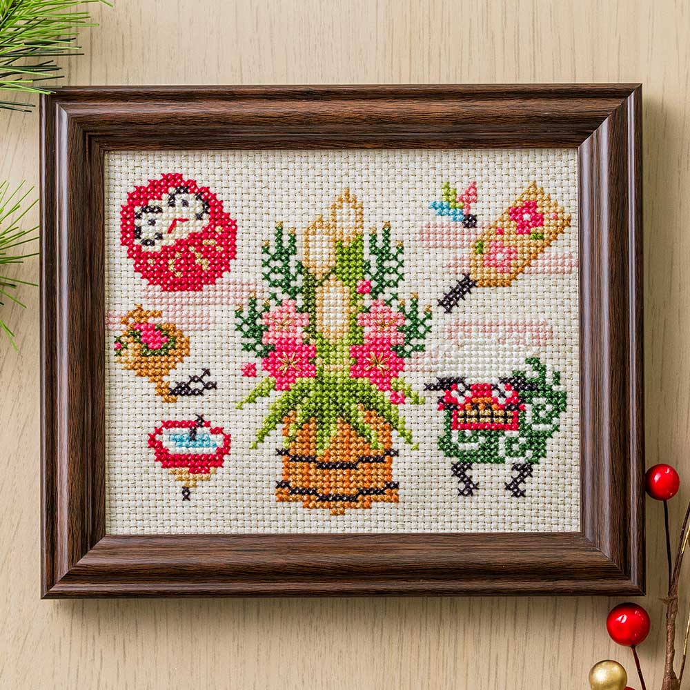 【キット作り方つき】ラメ糸が上品に輝くクロスに、門松やだるま、獅子舞など縁起のいいモチーフをクロスステッチ。フレームつきなので作ってすぐに飾れます。初~中級の方向きです。