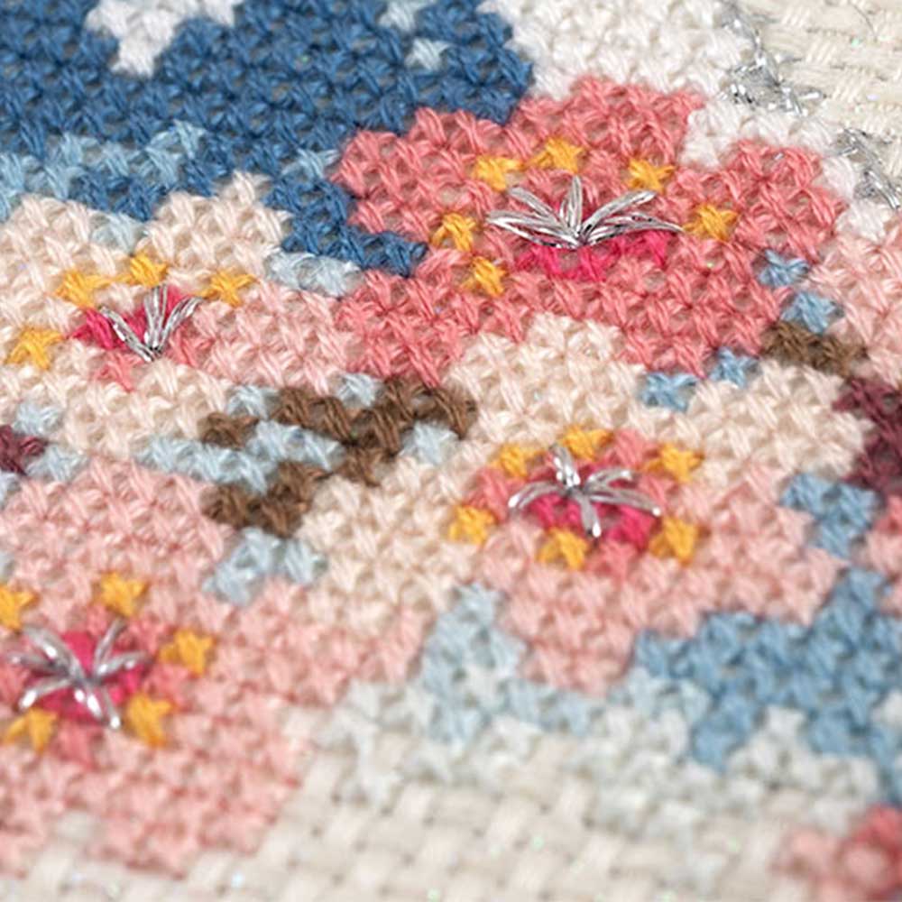 【キット作り方つき】【フレームつき】 オフホワイト×オーロラのラメジャバクロスに、富士山と桜の花を描きました。 陽の光に照らされて輝く、富士山の冠雪や桜のしべにはシルバーのラメ糸がきらり。程よいボリューム感でクロスステッチを お楽しみいただけます。 完成したら すぐに飾れるフレーム付き。初~中級の方向き。