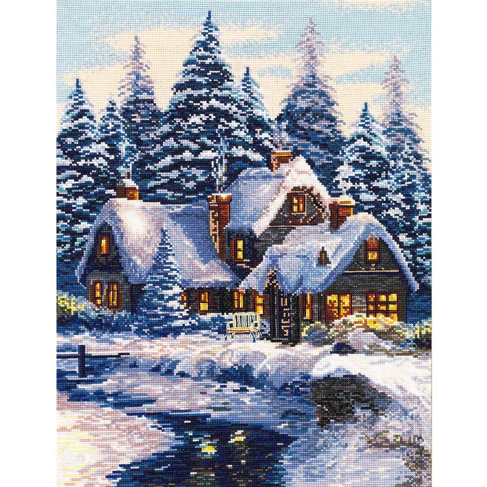 【キット作り方つき】 青と白のトーンが美しい幻想的な冬景色を描いたクロスステッチ作品です。建物からこぼれるオレンジの灯かりが川面にも写ります。上級の方向け。ウクライナ・VDV社製。
