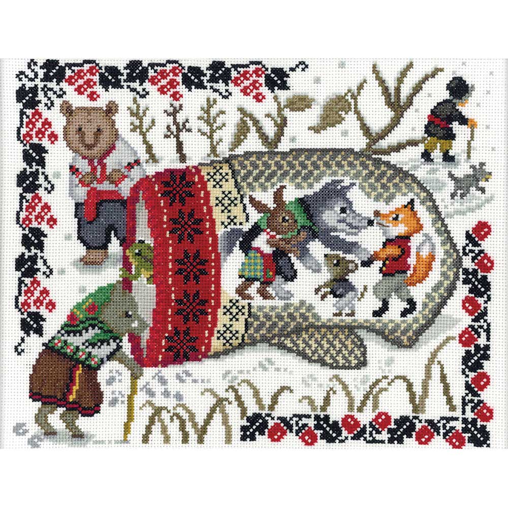 [キット作り方つき] 童話「てぶくろ」のいくつかのシーンをクロスステッチで表現した冬にぴったりな作品です。上級の方向け。2本取りでクロスステッチします。
