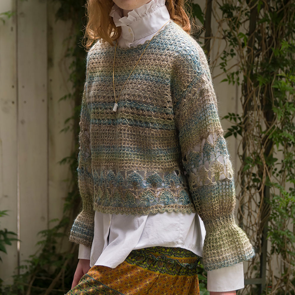 刻々と色を変えるグラデーションヤーンと、5種類のクロッシェ模様のコラボレーションが美しいプルオーバー。袖の途中をキュッと絞って作る、キャンディスリーブがチャームポイントです。