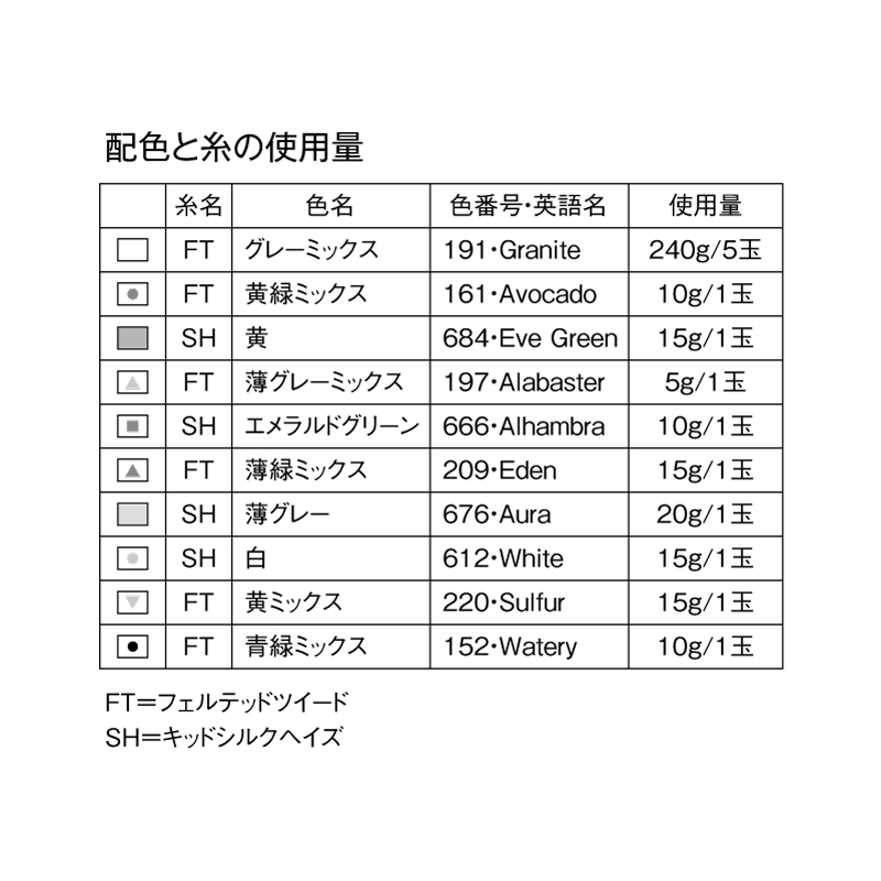 材料:ローワン フェルテッドツイード、キッドシルクヘイズ 糸の色名・色番号・使用量は図中の票を参照してください。