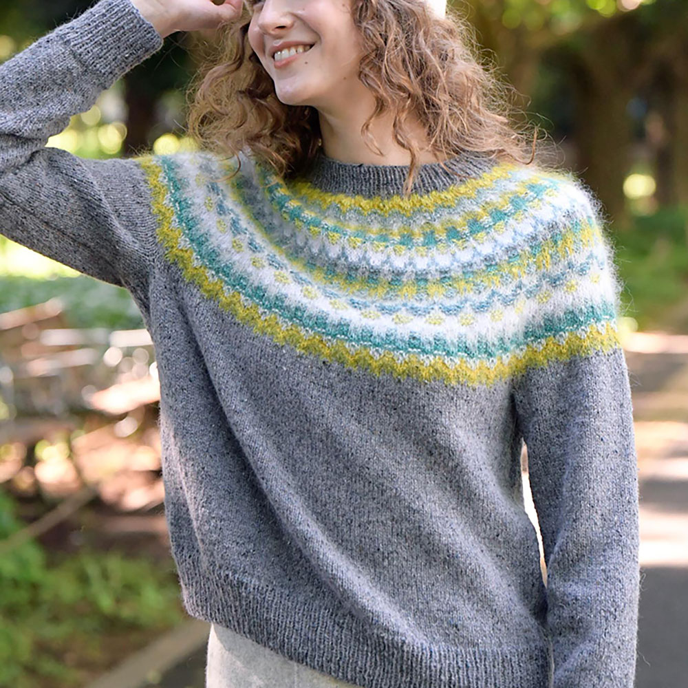 スウェーデンのボーヒュース風に。毛足の長い糸で裏目まじりの編み込みをすることで、模様がにじんだような独特のニュアンスが生まれます。イエローからグリーンへのレンジの中で色を駆使した美しいカラーリングに心をつかまれます。