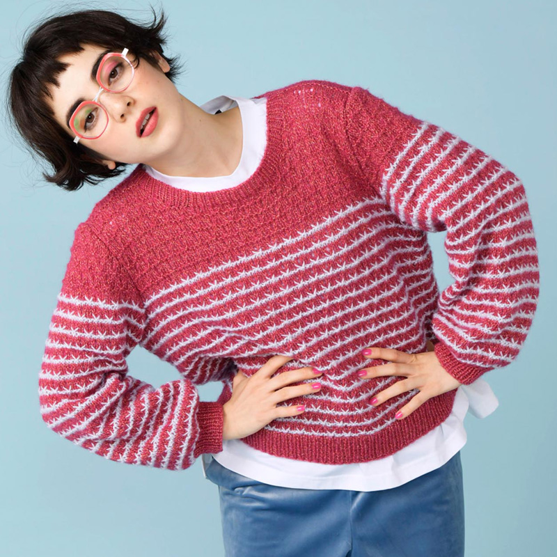 赤っぽいピンク色を選んでシルバーグレーとのバイカラーに。甘さを抑えた色合いが、大人も着られる配色のボーダーニットになりました。ポツポツと並ぶV字のすべり目が印象的なアクセントになった模様は、単色部分にも配されてボーダー部分とは別の面白さを実感します。