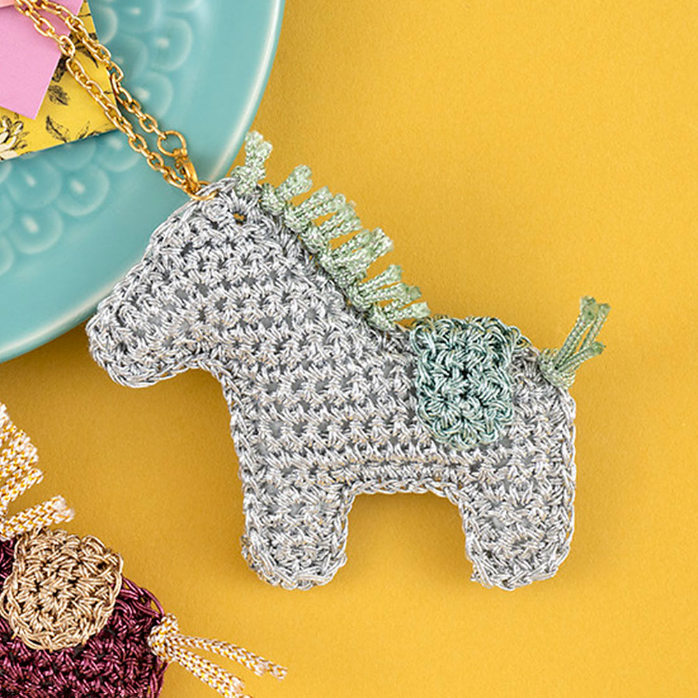 【キット作り方つき】かぎ針初心者の方でも編みやすい、柔らかなメタリックフリーコードで編むチャームです。きらきら感がバッグなどのアクセントになります。2色をご用意しました。