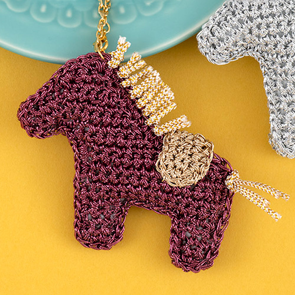 【キット作り方つき】かぎ針初心者の方でも編みやすい、柔らかなメタリックフリーコードで編むチャームです。きらきら感がバッグなどのアクセントになります。2色をご用意しました。