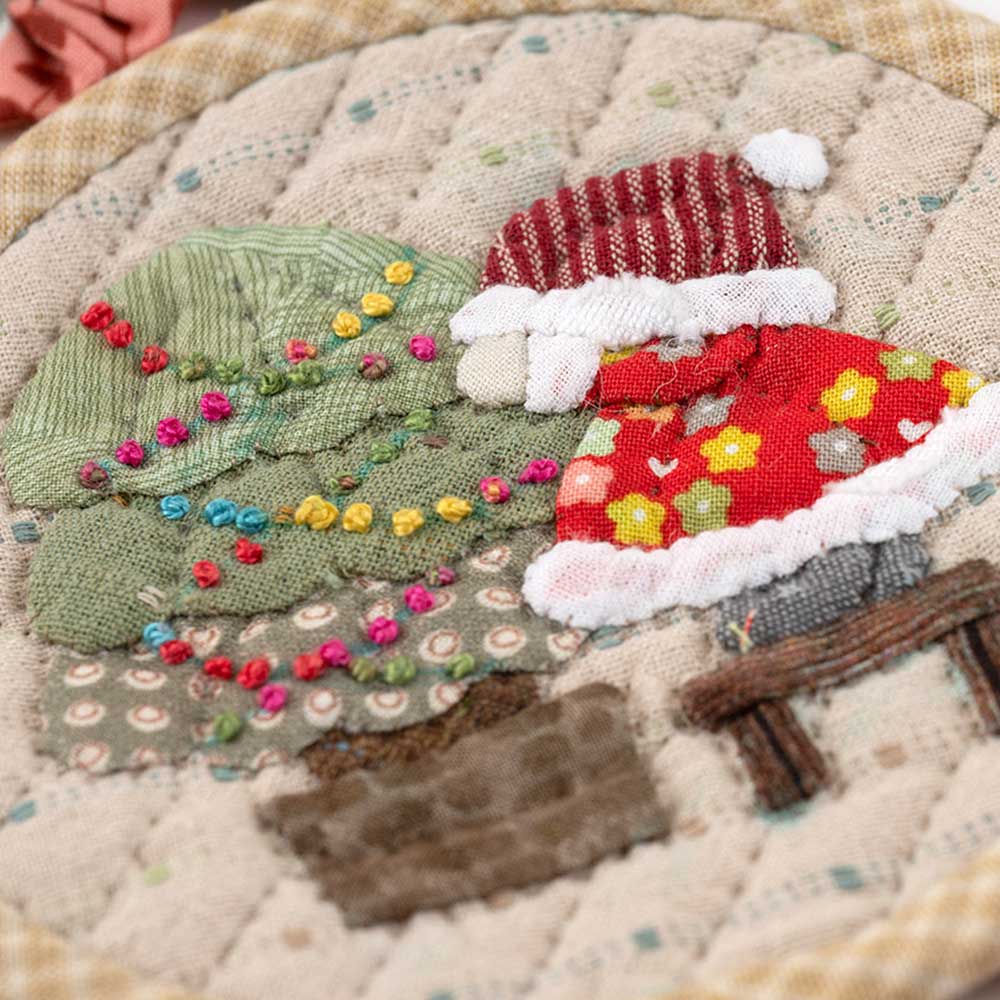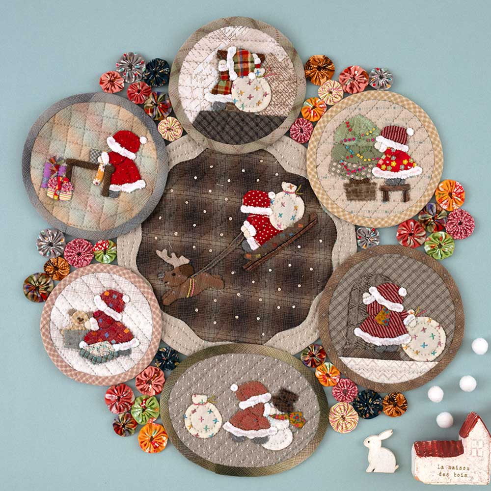 【キット作り方つき】可愛い“ スーちゃんサンタ” をアップリケしたタペストリーです。円形パーツを1枚ずつ作って縫い合わせます。パーツの間のヨーヨーキルトでさらに可愛さアップ?