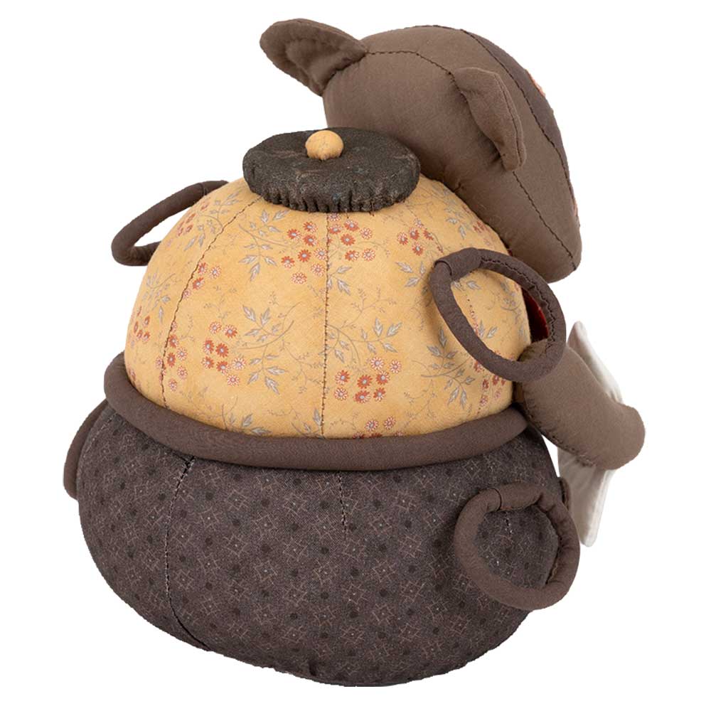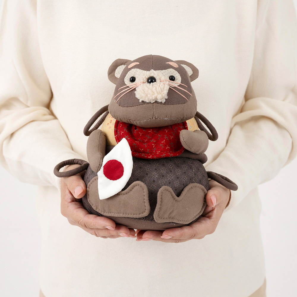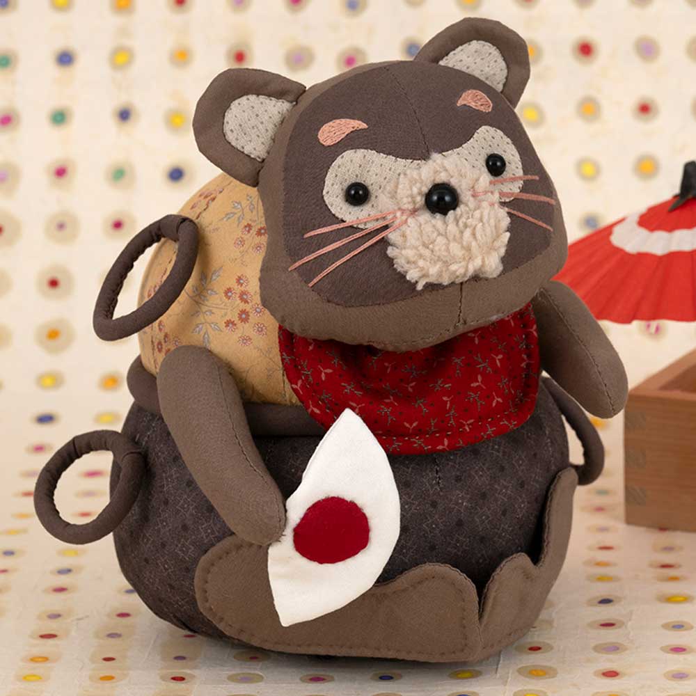 【キット作り方つき】茶釜に化けた子ダヌキの可愛い縫いぐるみです。日の丸の扇を持って、今にも踊り出しそうなおどけた表情 に心が和みます。