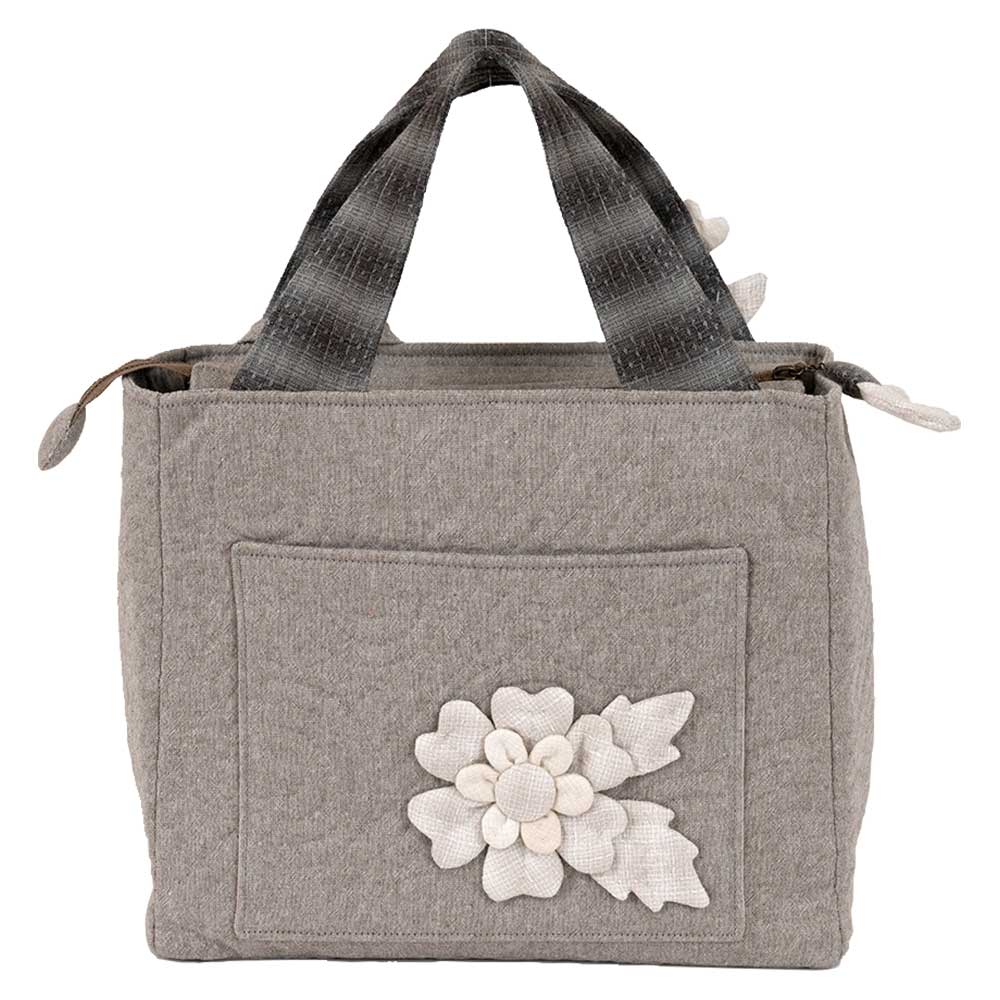 【キット作り方つき】白と淡いグレー系の先染め布を使い、大胆にデフォルメした花をアップリケ。チャームにもなるお揃いのポーチも作ります。装いの上品なポイントにもなりそうです。
