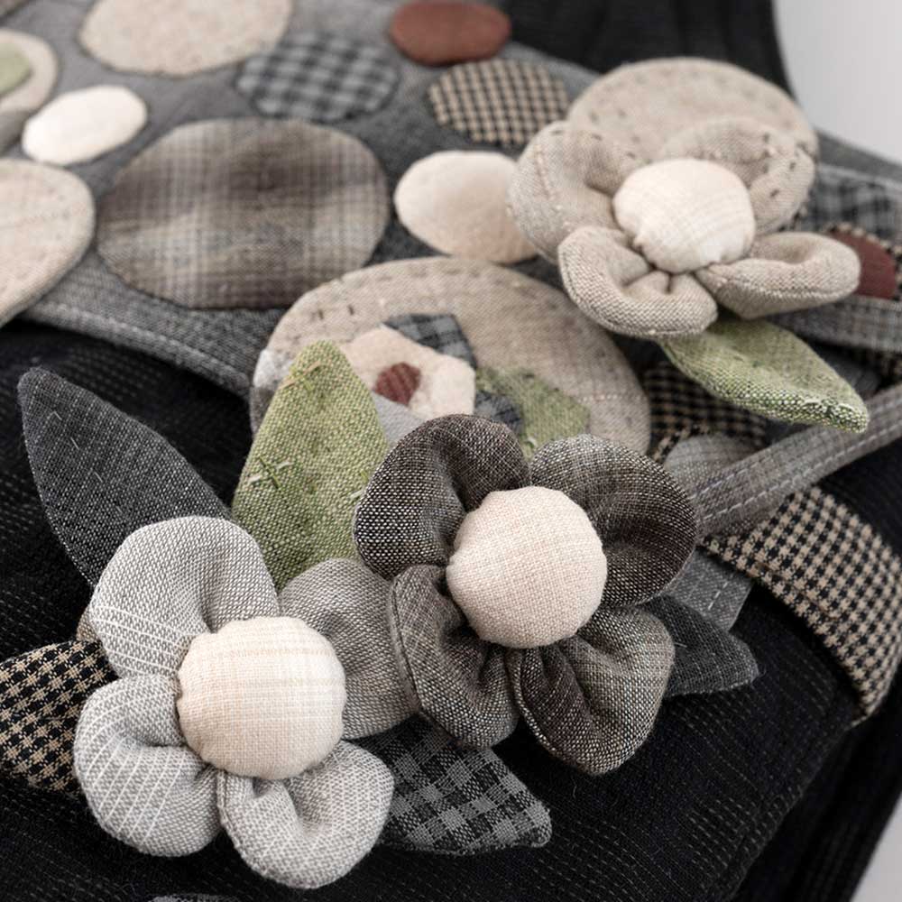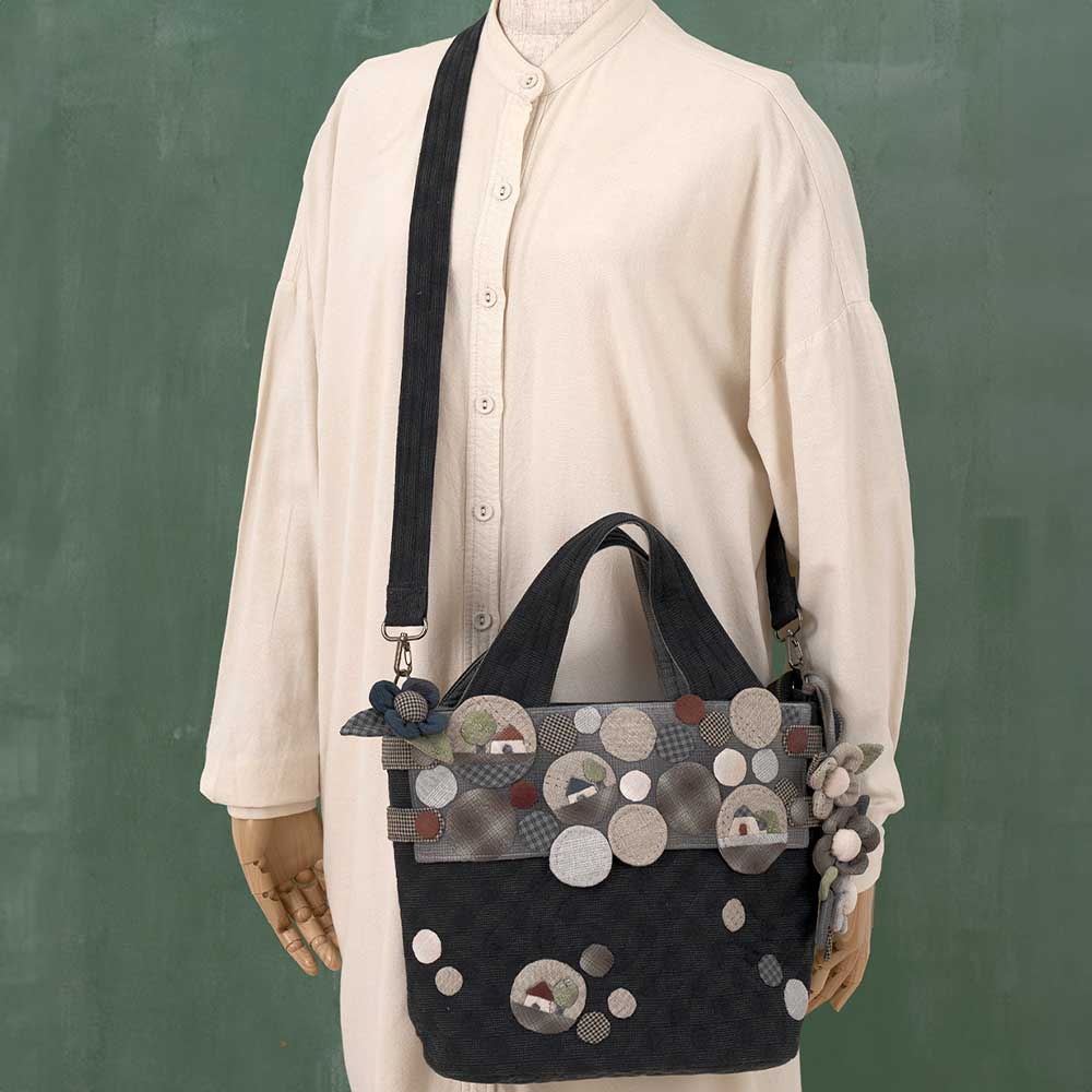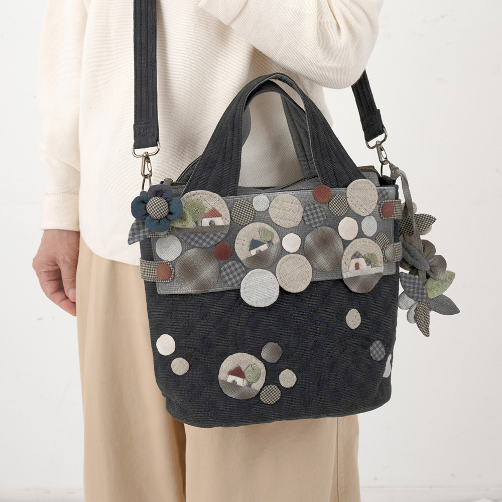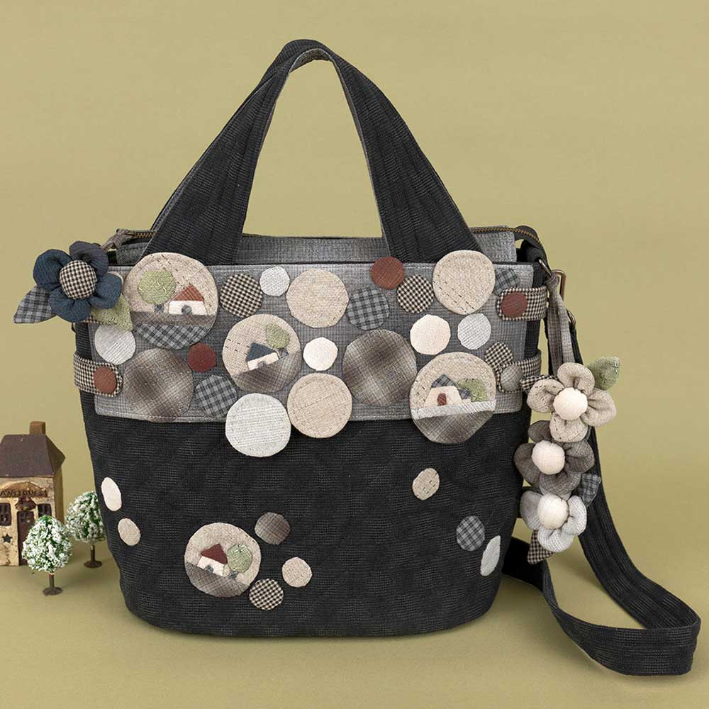 【キット作り方つき】ハウスなどをアップリケした、雪玉のような丸いモチーフを前面に散りばめました。手さげにも肩掛けにもなって便利です。入れ口にはファスナーをつけます。