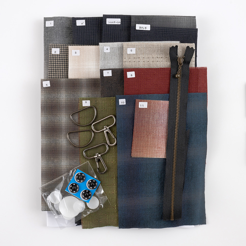表布、裏布、ファスナー、スナップボタン、ナスカン、Dカン