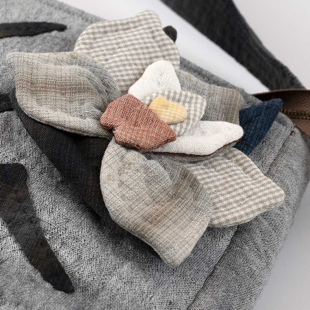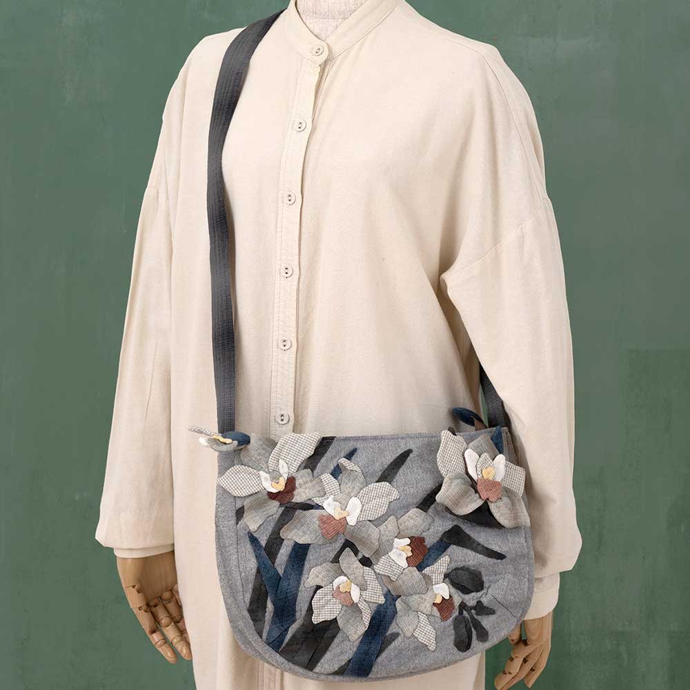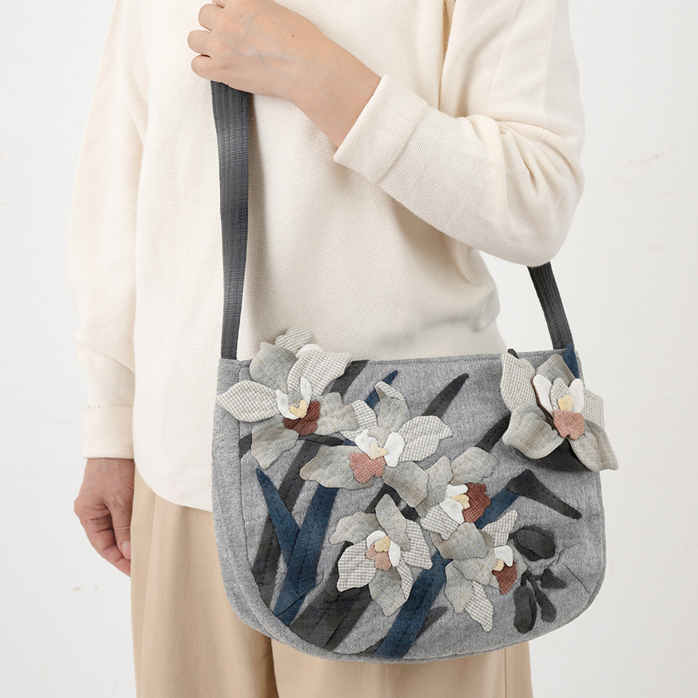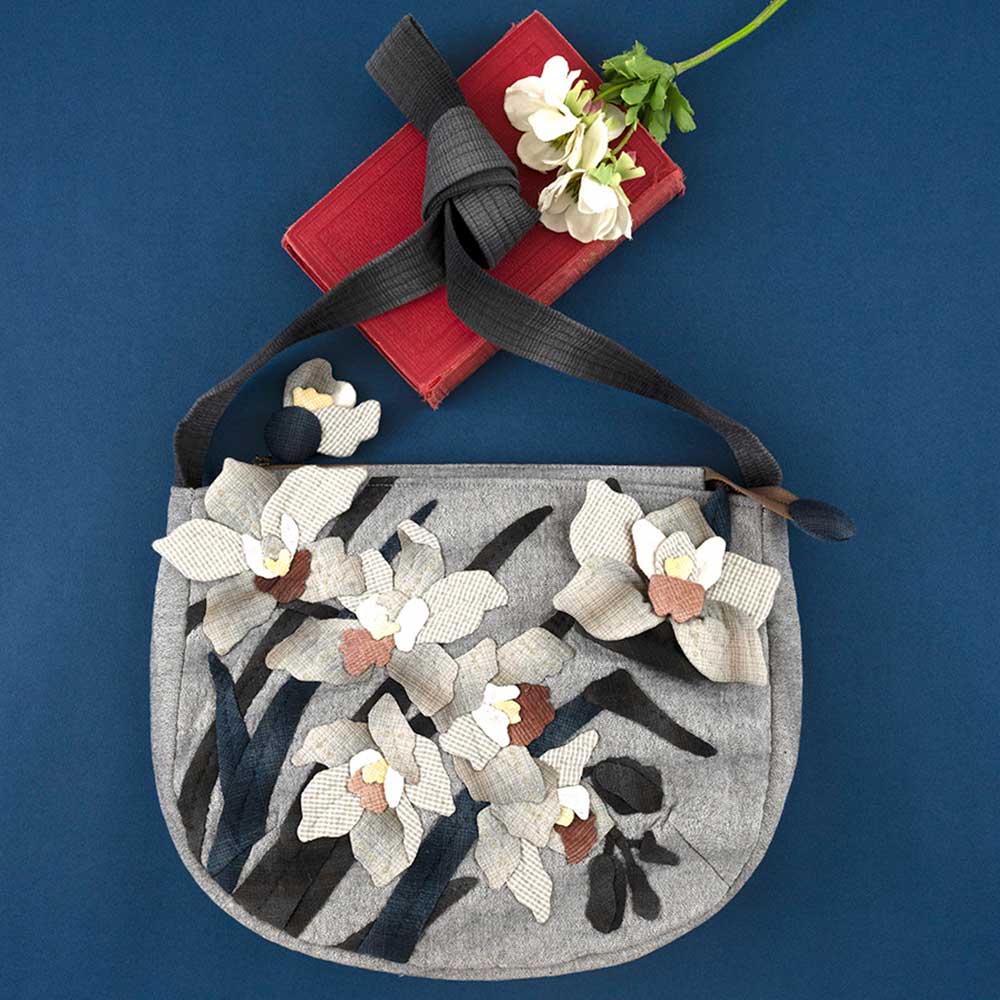 【キット作り方つき】多種の先染め布で、シンビジウムの花をリアルにアップリケ。1輪はブローチにもなるよう立体的に仕立て、ファスナー部分にも花モチーフをつけて仕上げます。
