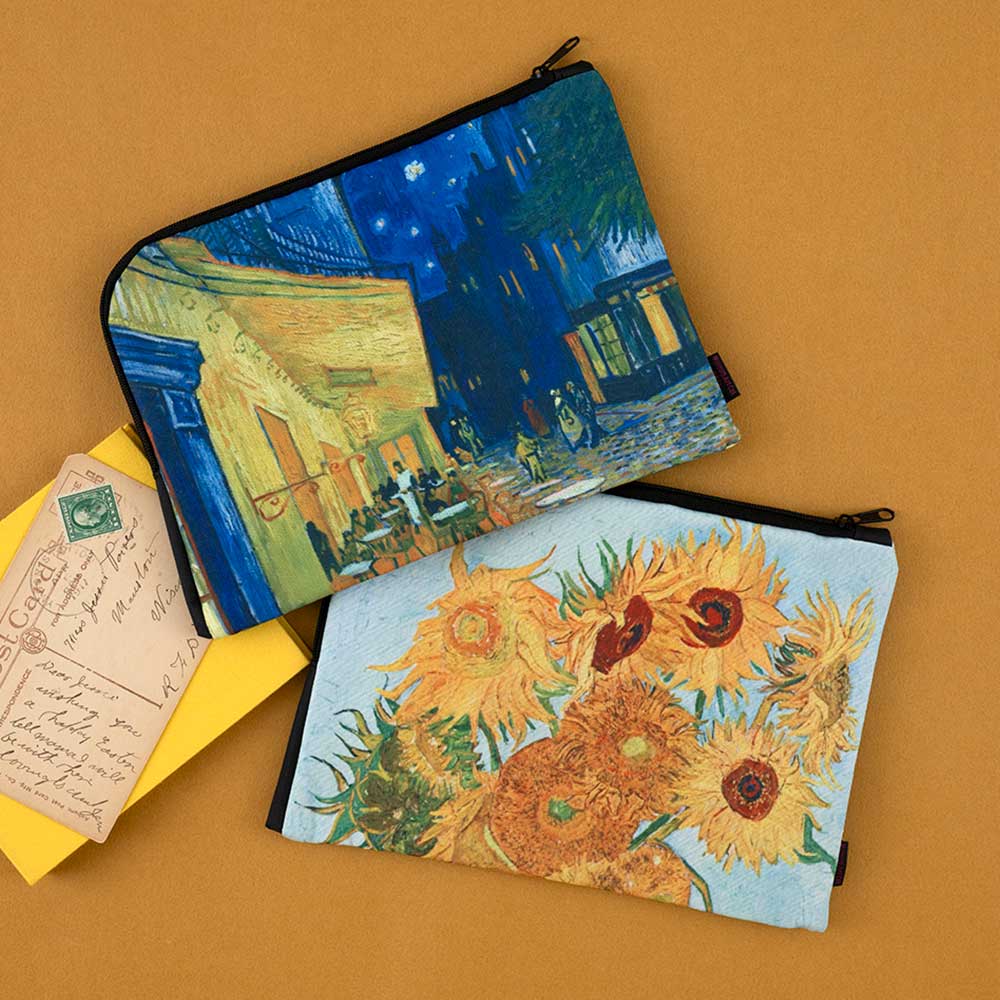 【完成品】「夜のカフェテラス」「ひまわり」をデザインした、フラットタイプのポーチセット。場所を取らないのでバッグの中身の整理に便利です。