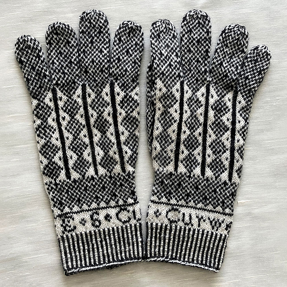 イギリスのノースヨークシャーという地域では、産業革命が起きるまで、プロのニッターが数多く活躍していました。ほとんどのニット作家の作品は現存していないのですが、デントで生まれ育ったニッターのメアリー アレンさん(1857-1924)の作品が、デールズ カントリーサイド博物館で保管されています。その当時編まれれていた唯一私たちが見ることのできる作品です。 博物館の許可を得て編み図を作成しました。オリジナルの手袋にできるだけ忠実に作成しています。 デールズ手袋は、作り目を2色で作ることや立体的になる親指の増し目の部分に特徴があります。 メアリーさんのオリジナルの手袋はとても小さく、恐らく3プライの糸と1.50mm で編まれたのではと推測します。編んで使用していただけるように、3プライの糸と0号 の針で編んで頂くようにインストラクションを作成しています。細い針と細い糸で編む1目ゴム編は、ちょっと大変かもしれませんが、そこを過ぎるとあとは、模様を楽しみながら編んでいただけると思います。