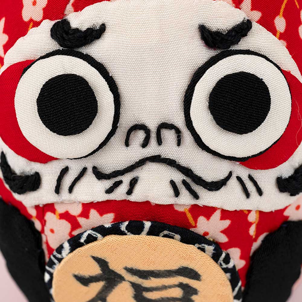 開運招福・家内安全・商売繁盛・必勝祈願と、様々な願いを込めて飾られるだるまを小さな置き飾りに。古裂の柄を生かして作り、福の字はペンで手書きします。