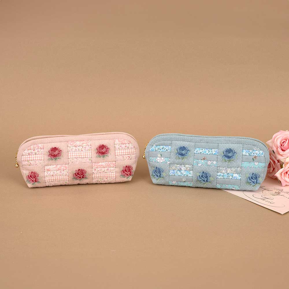 【作り方つき】上質感のある、可愛いバラ模様の刺しゅう布のピースワークで仕立てるペンケースです。2色をご用意しました。後ろも同じデザイン。
