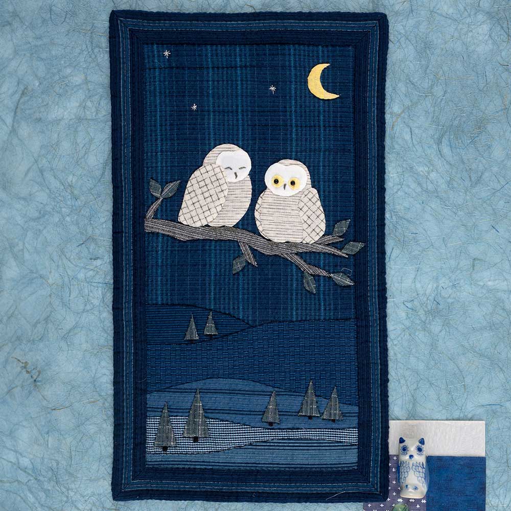 【キット作り方つき】山々を背景に、枝にとまる2羽のフクロウをアップリケ。遠近感のある夜の風景が神秘的です。空には銀の刺しゅう糸で星を描きます。