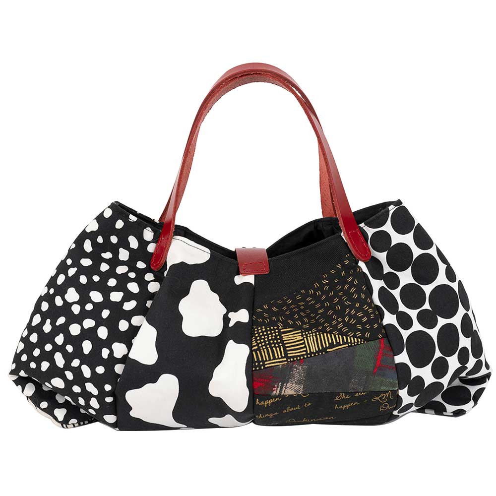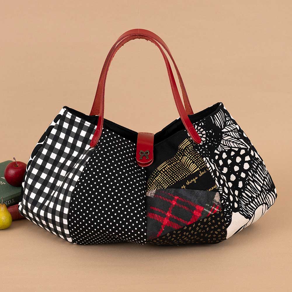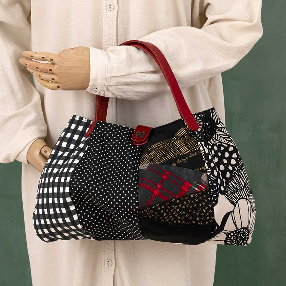 【作り方つき】赤と金をアクセントにしたモノトーンの布をつなぎ、タックでふっくらとした形に。本革製の赤いホックもポイントです。