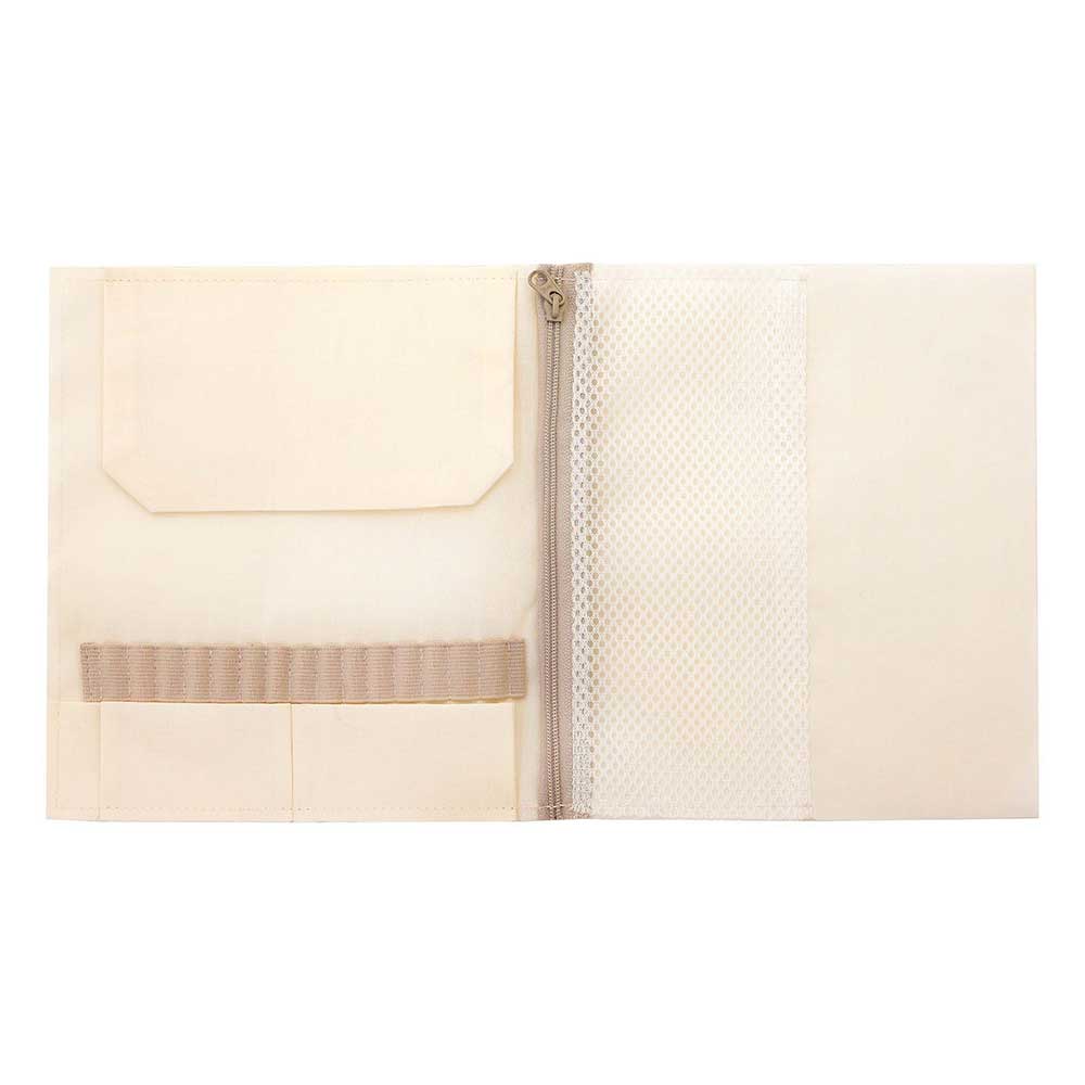 好みの編み地や布地を縫いつけてオリジナルケースが作れる、縫製済みのかぎ針ケース2色です。落下防止ストッパーや、小物が入るポケットつきの便利な作りになっています。