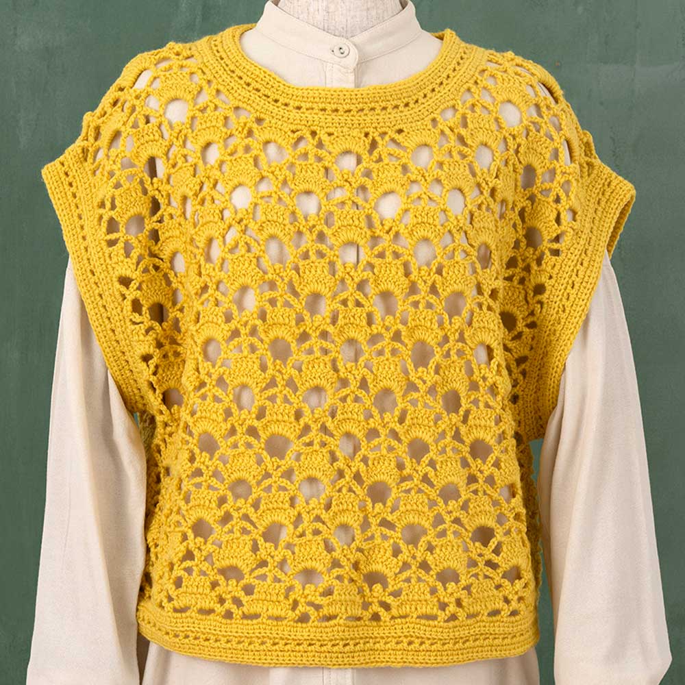 【作り方つき】ビタミンカラーのイエローと、トレンド感のあるオーバーシルエットもおしゃれなベストです。編みやすい並太ヤーンを使用します。初めての方にもお勧め。