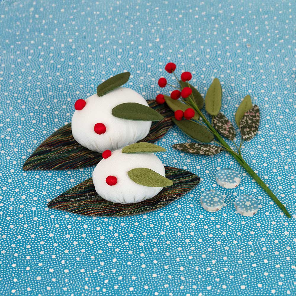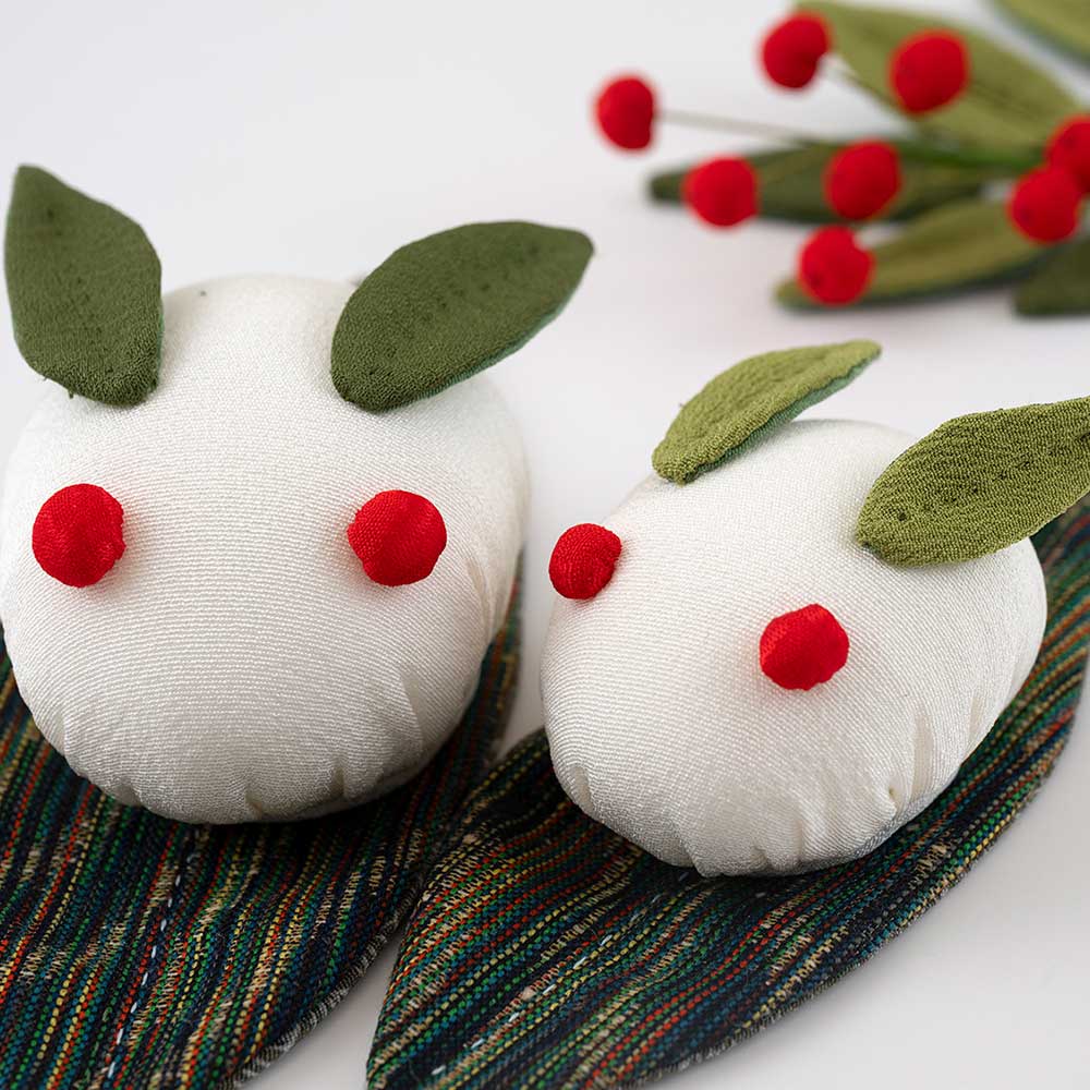 【キット作り方つき】【古裂】“ ツキ” を呼ぶとして冬の縁起物ともされている雪ウサギ。“ 難を転ずる” 南天も作る、お正月にもぴったりの可愛い置き飾りです。