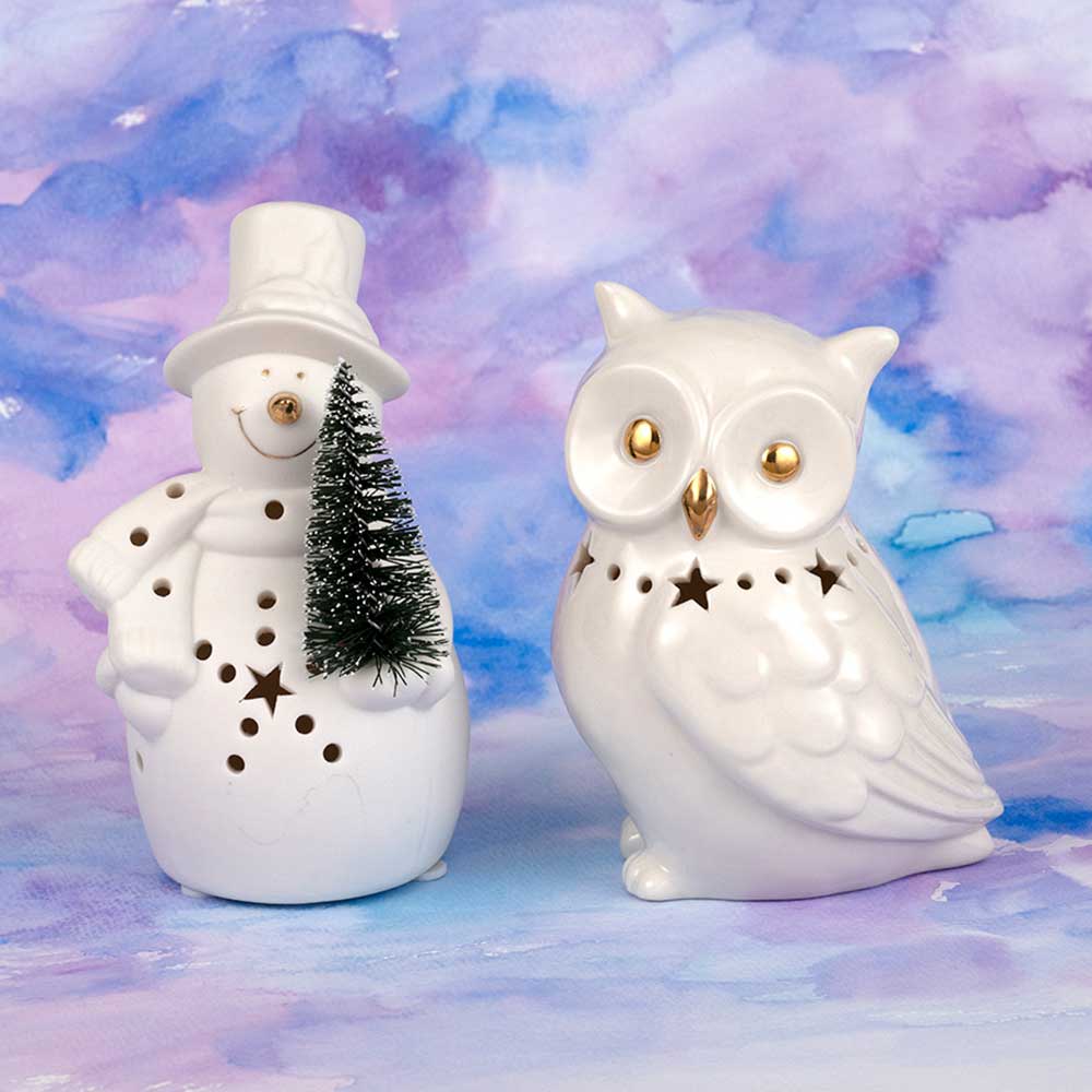 ツリーを持った素焼き風スノーマンと、大きな目が可愛い滑らか仕上げのフクロウ。質感も異なるセラミックライト2 種です。底のスイッチで点灯します。