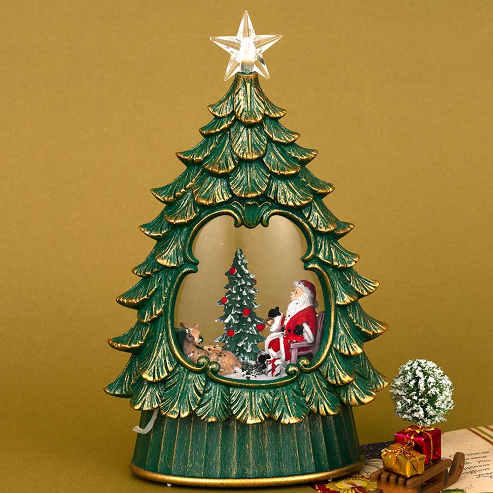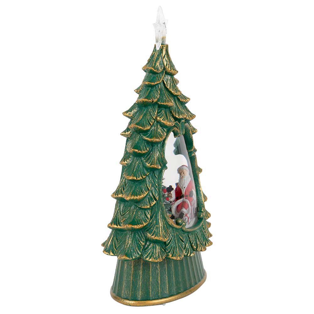 スイッチを入れるとラメが舞ってきらきら光る、シックな雰囲気のツリー型スノードームです。薄型で場所を取りません。