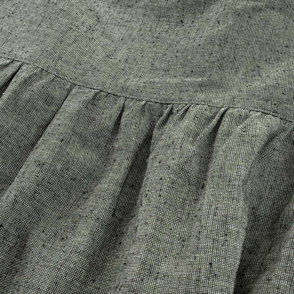 【完成品】グリーンがかったグレーの色も素敵なロング丈スカートです。普段着にもちょっとした集まりにも活躍するこだわりの1着に。右側にポケットがついています。
