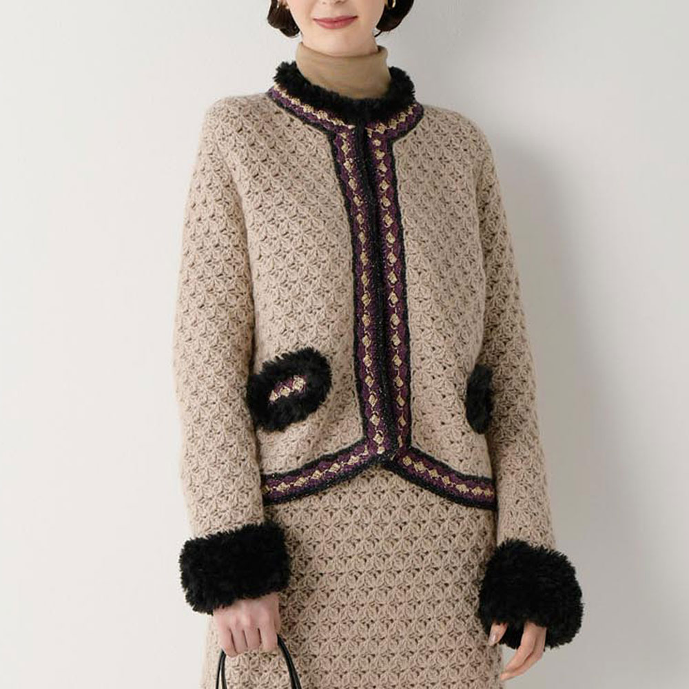 ブレード風の縁編みに、ファーのあしらいが華やかなかぎ針編みのニットスーツ。松編みと引き上げ編みを組み合わせた花のような模様編みも印象的です。ボリュームのある袖口は棒針のガーター編みで仕上げています。