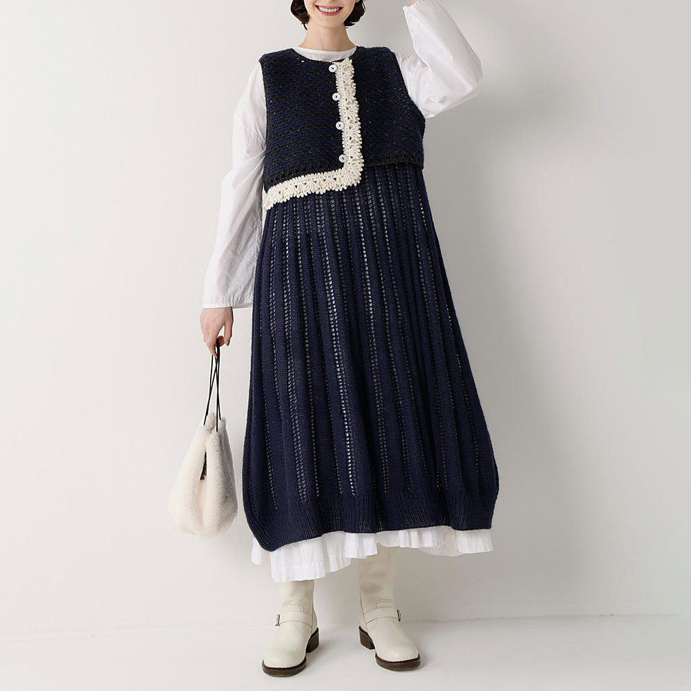 ガーリーなセットアップは、ベストはかぎ針編み、バルーンシルエットのワンピースは棒針編みとニュアンス違いの組み合わせ。アシンメトリーな前立てのフリルが目を惹くベストは、ストレートヤーンとスパンコール入りヤーンを縞にして、キラリと光るアクセントをプラスしています。フリル部分には熱で硬化する糸を引き揃えて形をキープ。