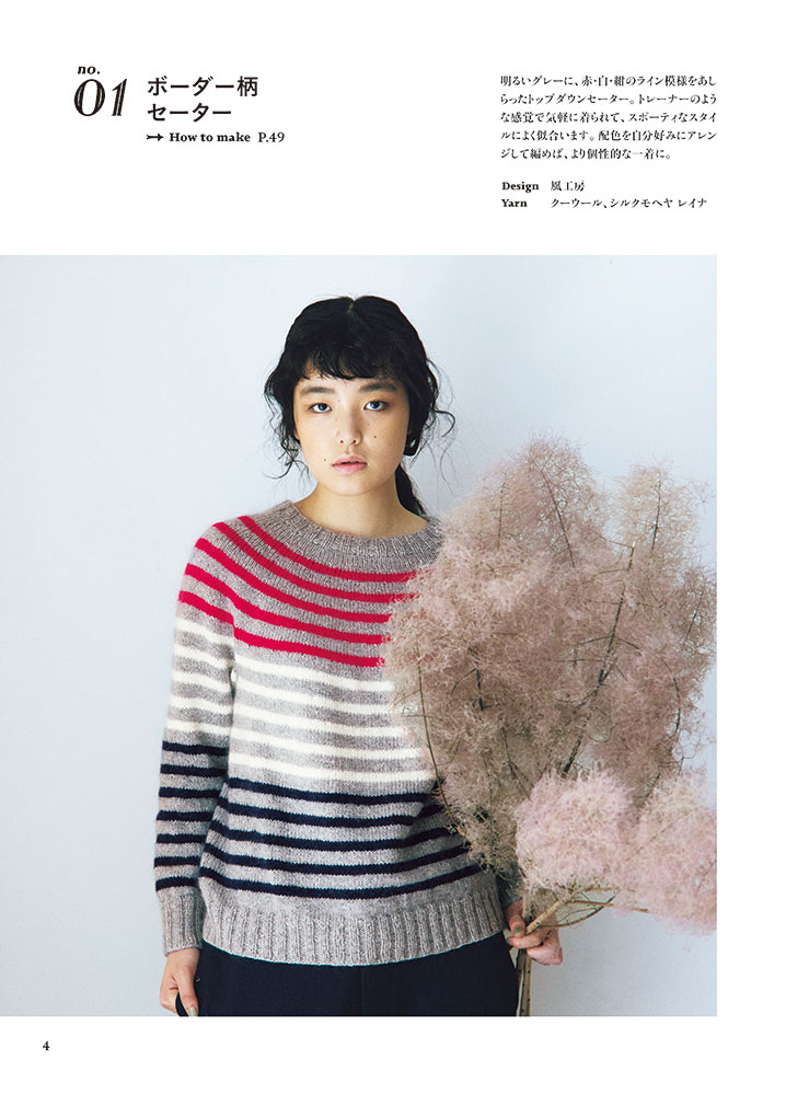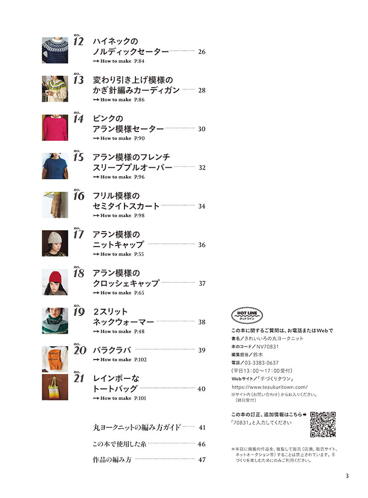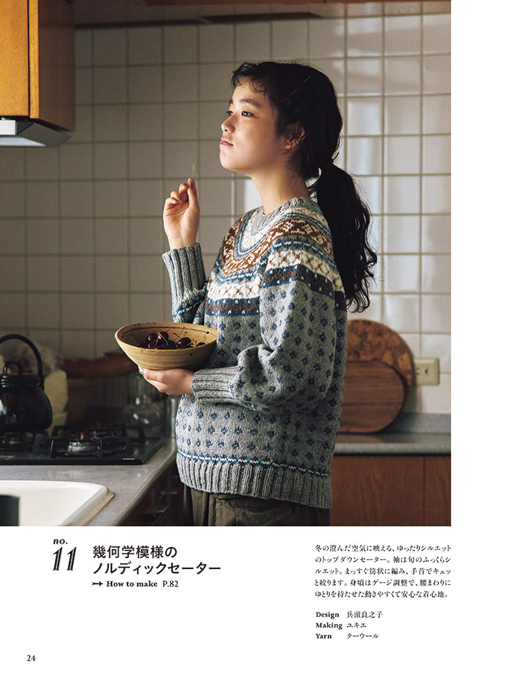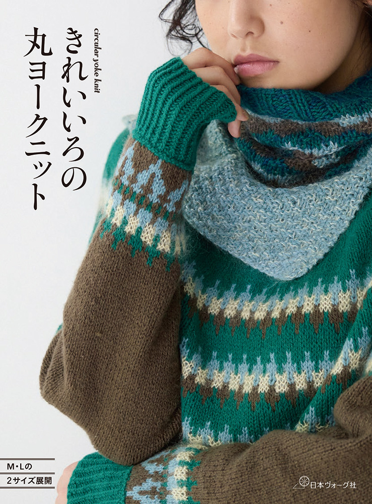 丸ヨークニットは身頃の肩・胸・背中を続けてぐるぐると円形に編まれた形状で、肩に継ぎ目がなく模様を効果的に編み入れることができるのが魅力! シンプルなボーダー模様のカーディガンからノルディック風の編み込みセーターから小物まで21点を掲載。MサイズとLサイズの2サイズつき。