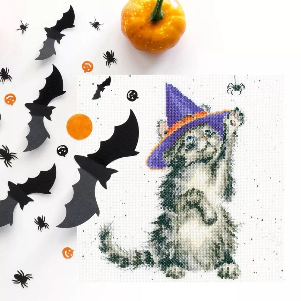 魔女の仮装をした可愛らしい子猫のクロスステッチキット。