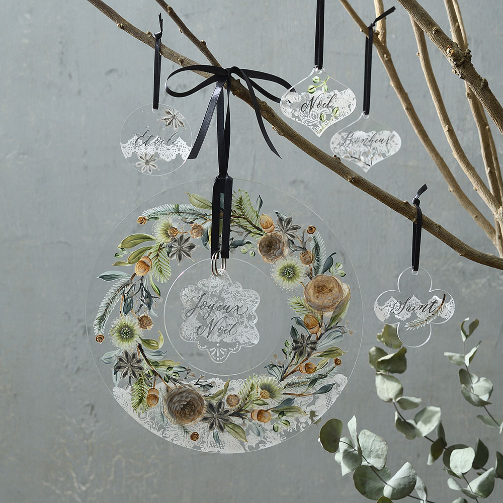透明なアクリルのリースに、シックなアースカラーで、モミの枝、ユーカリ、シダーローズ、ドングリ、松ぼっくり、スターアニスのリースを描きます。初級~中級のテクニックで描けます。ドライフラワーのイメージでシンプル&ナチュラルなインテリアに合わせてもおしゃれ。素材が透明なので、実物大カラーコピーを下に敷いて描いていくと便利です。レースとモダンカリグラフィーの文字は、シルクスクリーンを使ったプリントで、手軽に仕上げられます。レース模様は、裏面からシルクスクリーンをプリントします。『「牡丹の新春リース」を描く』の作品とセットで飾っても素敵。