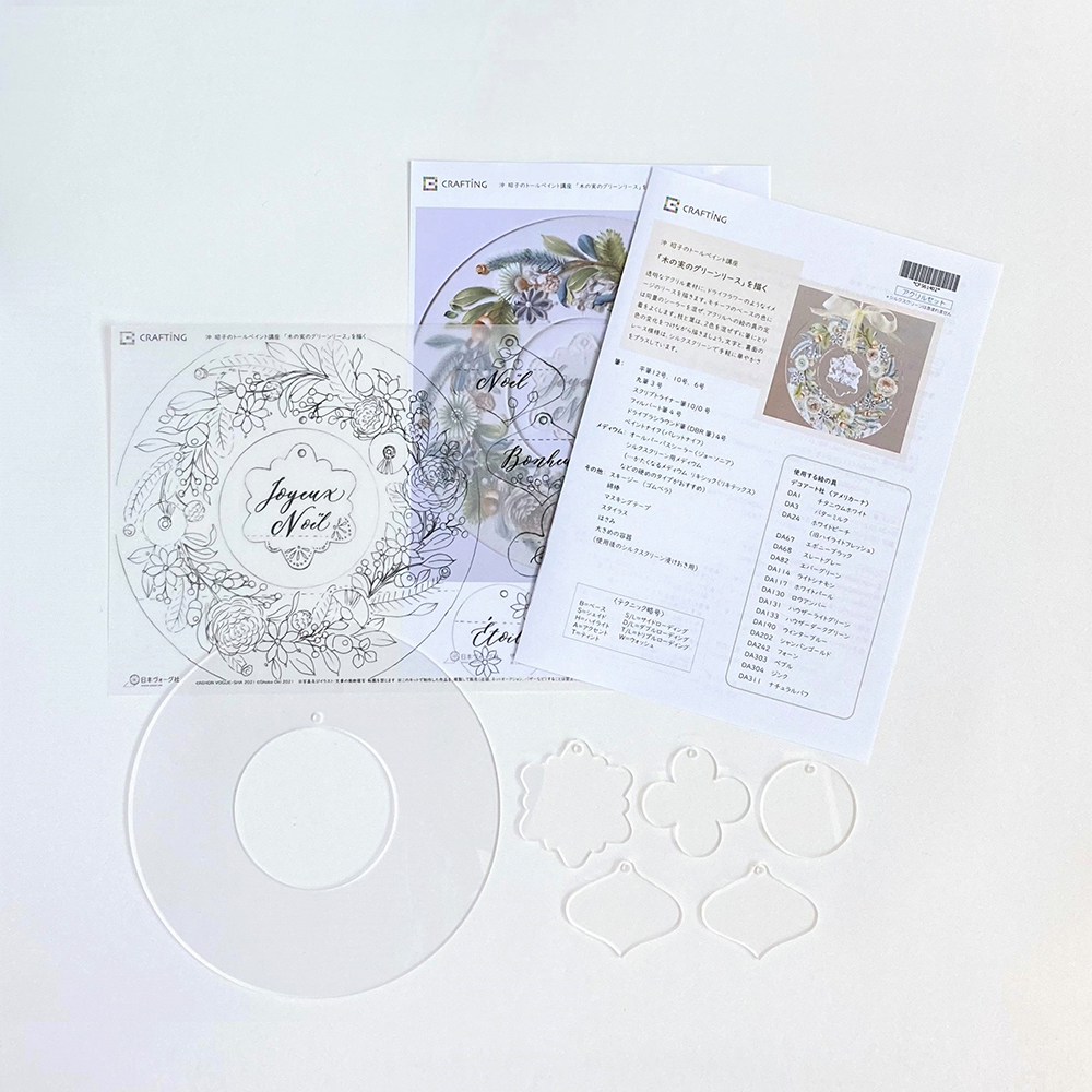 『ペイントクラフトデザインズvol.22』の58ページ掲載「木の実のグリーンリース」が描けます。透明なアクリルのリースに、シックなアースカラーで、モミの枝、ユーカリ、シダーローズ、ドングリ、松ぼっくり、スターアニスのリースを描きます。初級~中級のテクニックで描けます。ドライフラワーのイメージでシンプル&ナチュラルなインテリアに合わせてもおしゃれ。素材が透明なので、実物大カラーコピーを下に敷いて描いていくと便利です。レースとモダンカリグラフィーの文字は、シルクスクリーンを使ったプリントで、手軽に仕上げられます。レース模様は、裏面からシルクスクリーンをプリントします。『「牡丹の新春リース」を描く』の作品とセットで飾っても素敵。