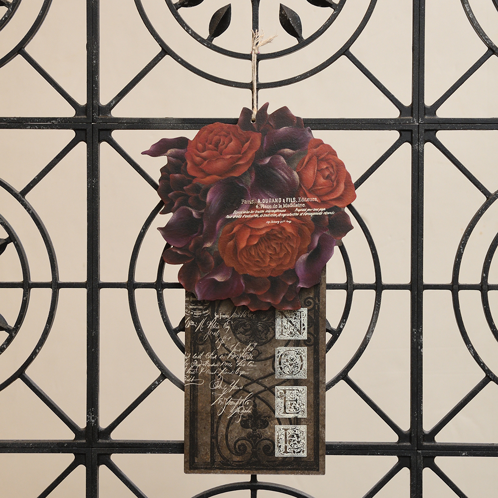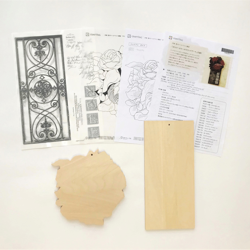 河崎 香デザインの「ボルドーカラーのラウンドブーケ」の使用素材のセットです。シルクスクリーンの図案は、アイアン模様、「NOEL」のイニシャル風文字、欧文。ほかの作品にも応用しやすい絵柄です。長方形パネルは、裏面を活用しやすいように、色違いアレンジを、色指定でご紹介。ブーケのプレートは、反転した図案を使えばもう1点描けます。長方形パネルは、色違いのアレンジなど手軽に裏面の活用ができます。色指定では、アイボリー系のアレンジ例のご紹介もしています。『ペイントクラフトデザインズvol.22』59ページ掲載