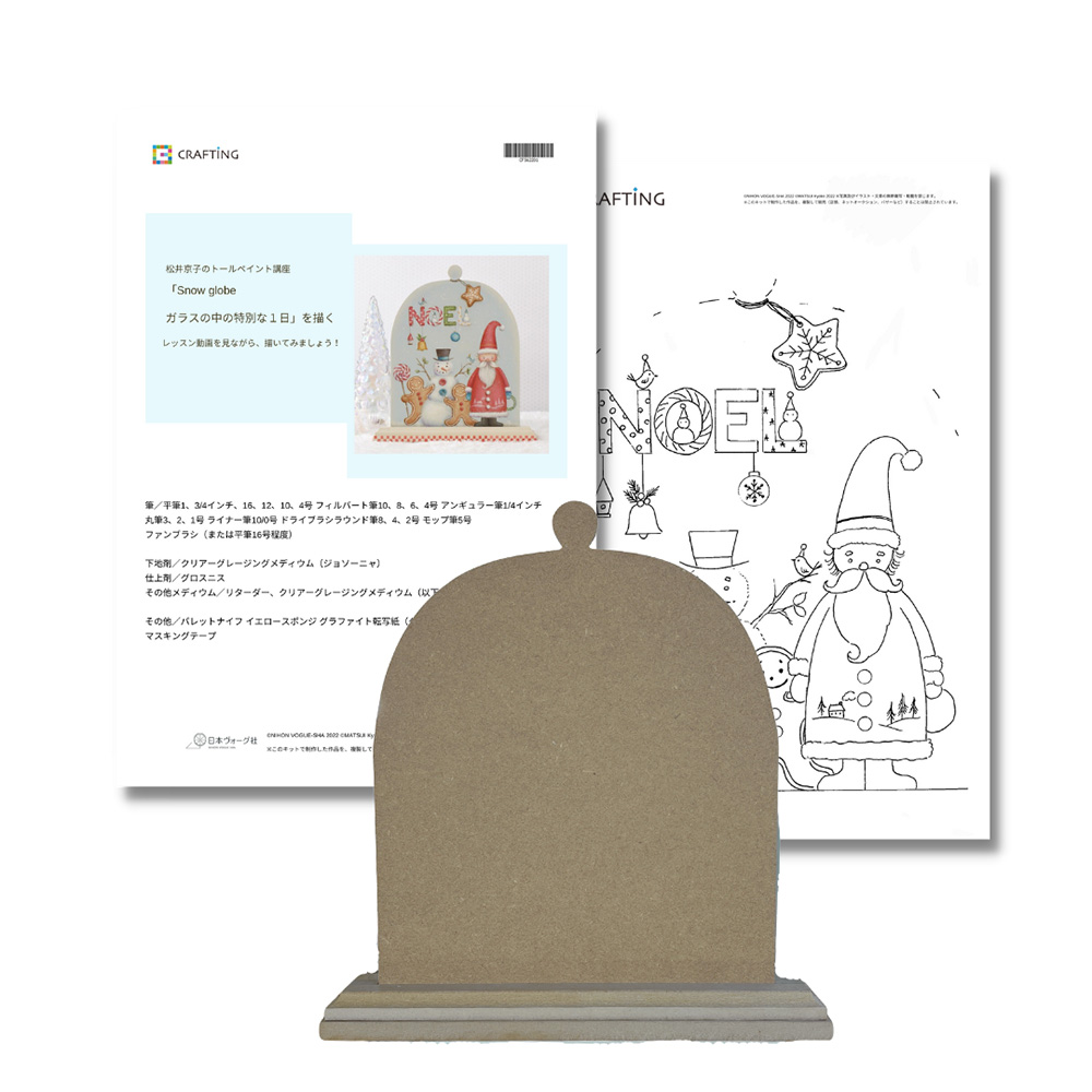 鉛筆でスケッチするような感覚で、輪郭線とシェイドを入れる、ブラシスケッチ技法が登場。丁寧に描き方のレッスンをしています。こだわりの土台デザインで高級感をプラスした、かわいらしいクリスマス作品。土台とカットアウト素材は接着せずにお届けするため、ペイントしてから組み立てられます。監修:松井京子
