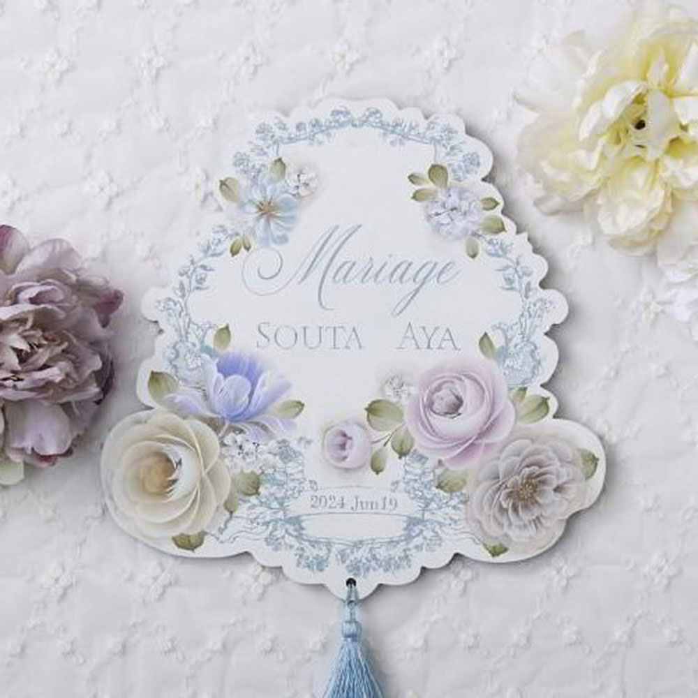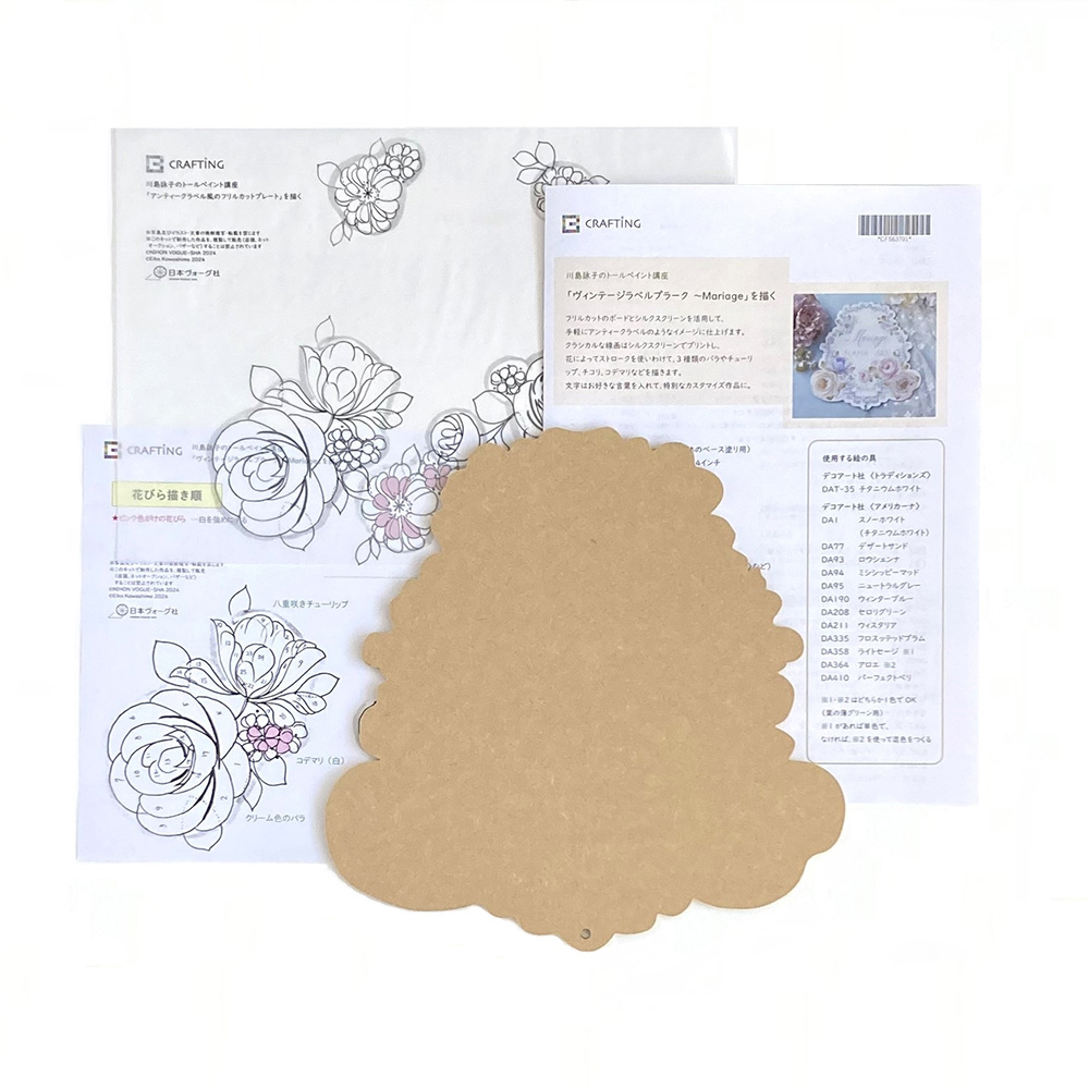 アンティークラベルのような形のボードに、細かい線画をシルクスクリーンで手軽にプリントし、3種類のバラ、八重咲きチューリップ、コデマリ、チコリのお花を描きます。ボード素材のフリルのようなカットは、線画のシルクスクリーンのデザインにぴったりとフィット。文字は、ウエディングのほか、姓字を入れてウエルカムボードに、店名&アイテムや業種を入れてショップサインに、など、お好きな言葉を入れて、カスタマイズを楽しめます。お好みでタッセルなどをつけても素敵。材料セットには、素材・図案・色指定のほかに、バラと八重咲きチューリップの花びら描き順解説がついています。『ペイントクラフトデザインズvol.27』58ページ掲載
