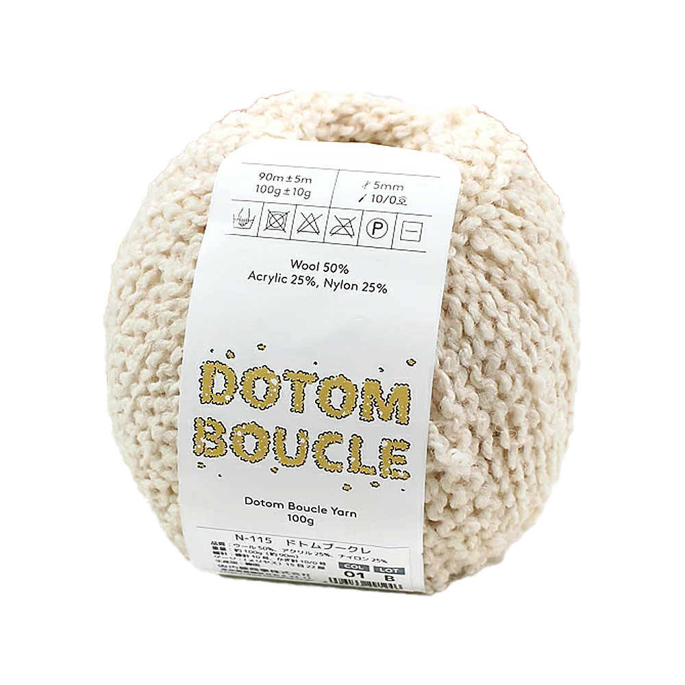 ウール50%のふっくらとしたブークレヤーンです。糸がしっかりしていて割れにくいため、バッグや帽子などの小物に適してます。メリヤス編みや細編みなどのシンプルな編地でブークレヤーン特有のふんわりしたかわいらしい仕上がりになります。