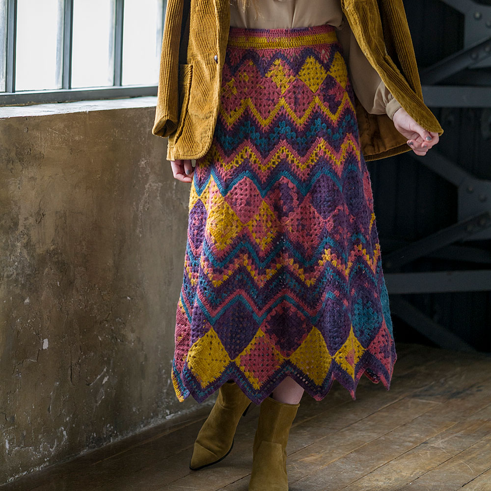 気分があがる、華やかなモチーフつなぎのスカート。グラニーモチーフにジグザグ模様と手編みらしさが溢れるデザインです。カラフルな 配色は段染め糸のなせる技。ただ針を動かして、段染めマジックに身を委ねて。