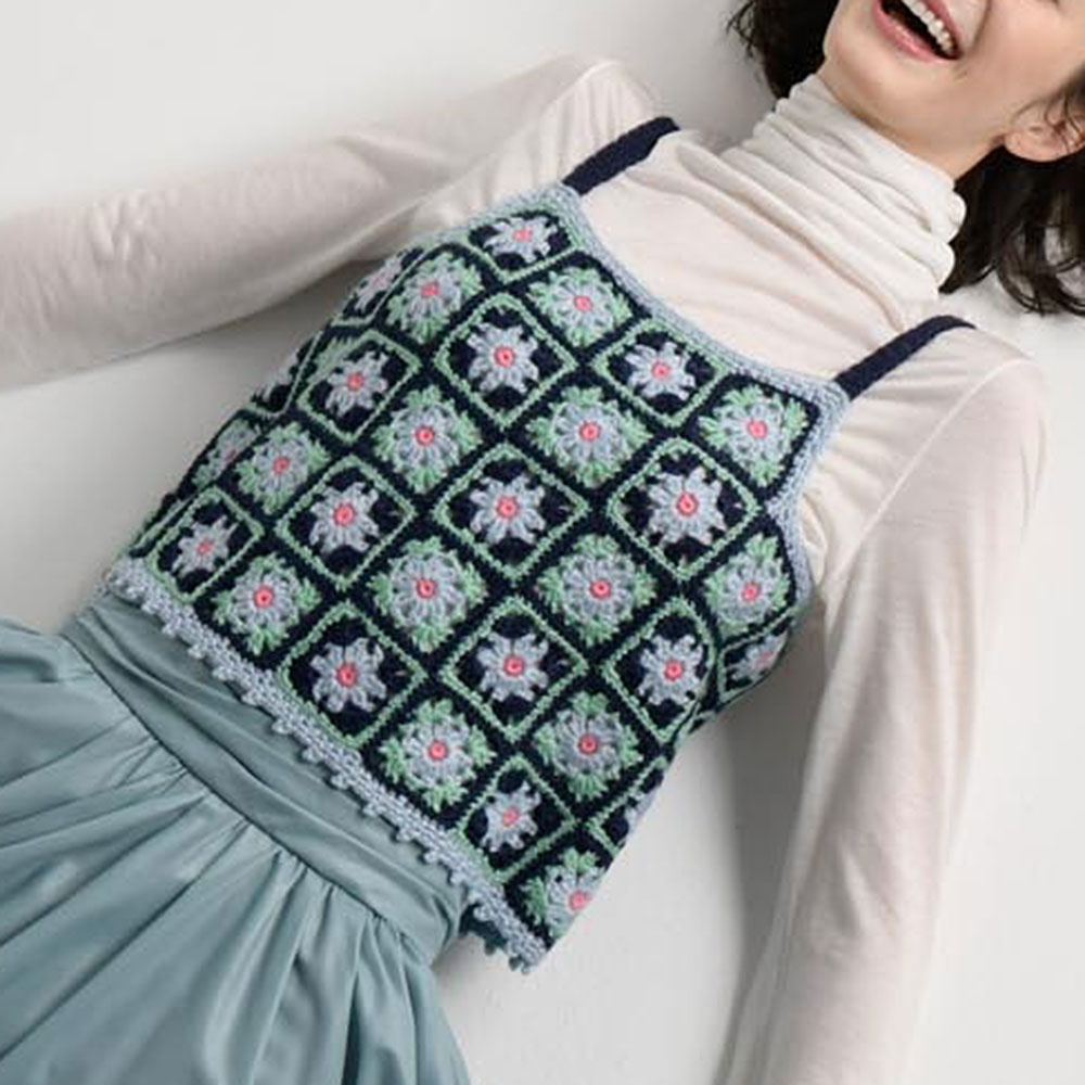 150cmサイズは、針の号数を1号上げて少し大きく編んだモチーフでサイズ調整しています。モチーフの数は130cmサイズと同じ。対照的な配色で2種類の違うモチーフを編んだように見せています。
