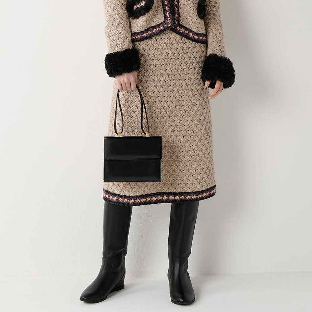 ブレード風の縁編みに、ファーのあしらいが華やかなかぎ針編みのニットスーツ。松編みと引き上げ編みを組み合わせた花のような模様編みも印象的です。ボリュームのある袖口は棒針のガーター編みで仕上げています。