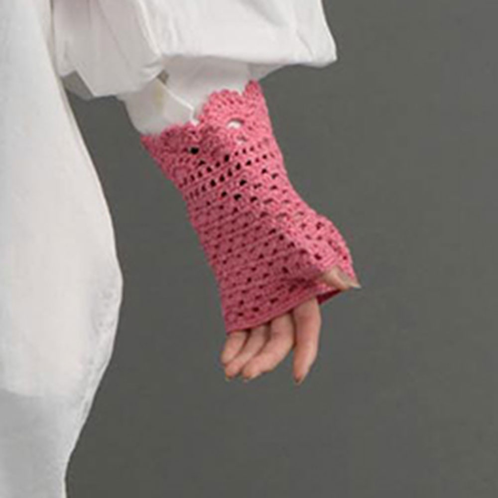 ラブリーカラーのハンドウォーマーはビスチェとのお揃いで抜群のインパクト。複雑な形状も目の増減が楽なかぎ針編みなら簡単です。ハンドウォーマーは親指を編み出して作る使いやすい仕様です。
